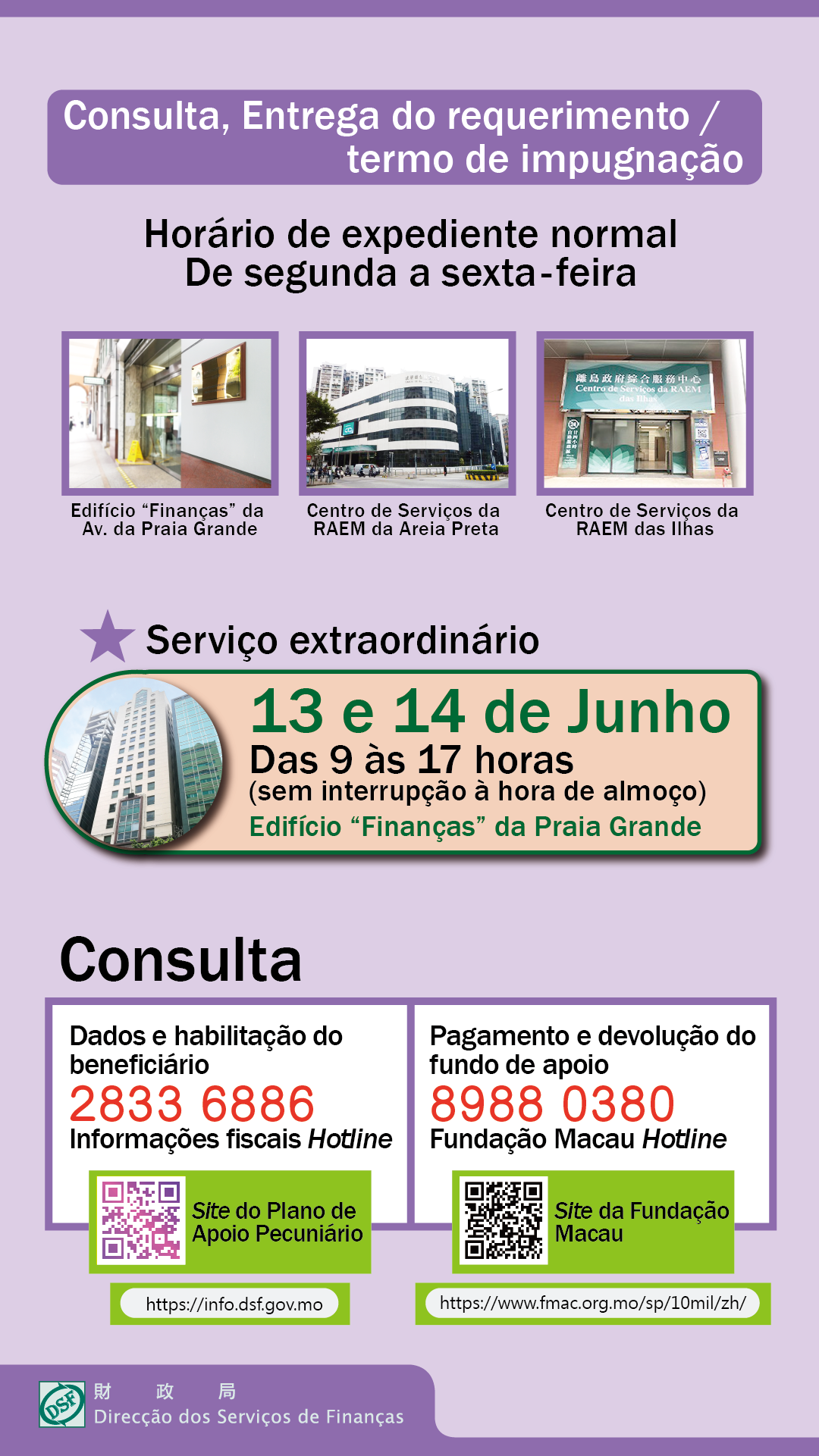 Na página electrónica exclusiva sobre o plano de apoio pecuniário, encontram-se disponíveis, o Regulamento Administrativo, as medidas relativas à atribuição do apoio pecuniário, as perguntas frequentes, a infografia e, entre outras, informações mais actualizadas para que os interessados possam consultá-las. Caso os interessados não se conformem com o resultado da consulta, podem descarregar o requerimento ou a impugnação na página electrónica ou levantá-los nos três postos de atendimento da DSF acima referidos, apresentando, junto da DSF, o respectivo documento, devidamente preenchido e acompanhado de outros meios de prova.