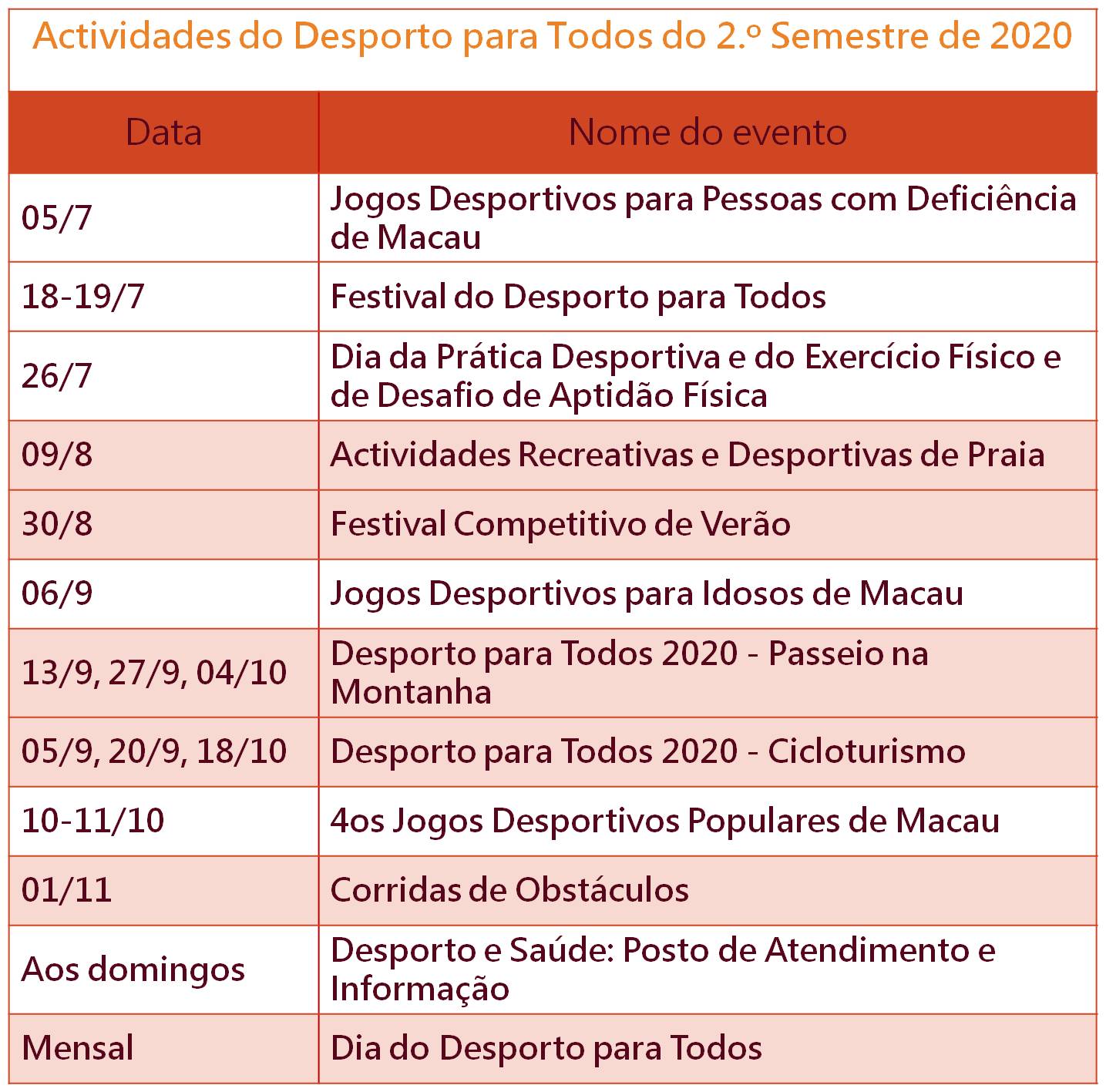 No âmbito do Desporto para Todos, para além das actividades contempladas no plano anual, o ID irá incrementar não só um vasto leque de novas actividades para o 2.o Semestre de 2020 (conforme quadro anexo) como também criar uma página no FACEBOOK “澳門大眾體育動向/TREND ON MACAU SPORT FOR ALL” onde podem encontrar informações actualizadas sobre as actividades de “Desporto para Todos”, “Escolas de Desporto”, pequenas dicas sobre o desporto, jogos interactivos online, etc. Sejam todos bem vindos a gostar e seguir a nossa página no FACEBOOK, para obter novidades e participar activamente no treino desportivo.