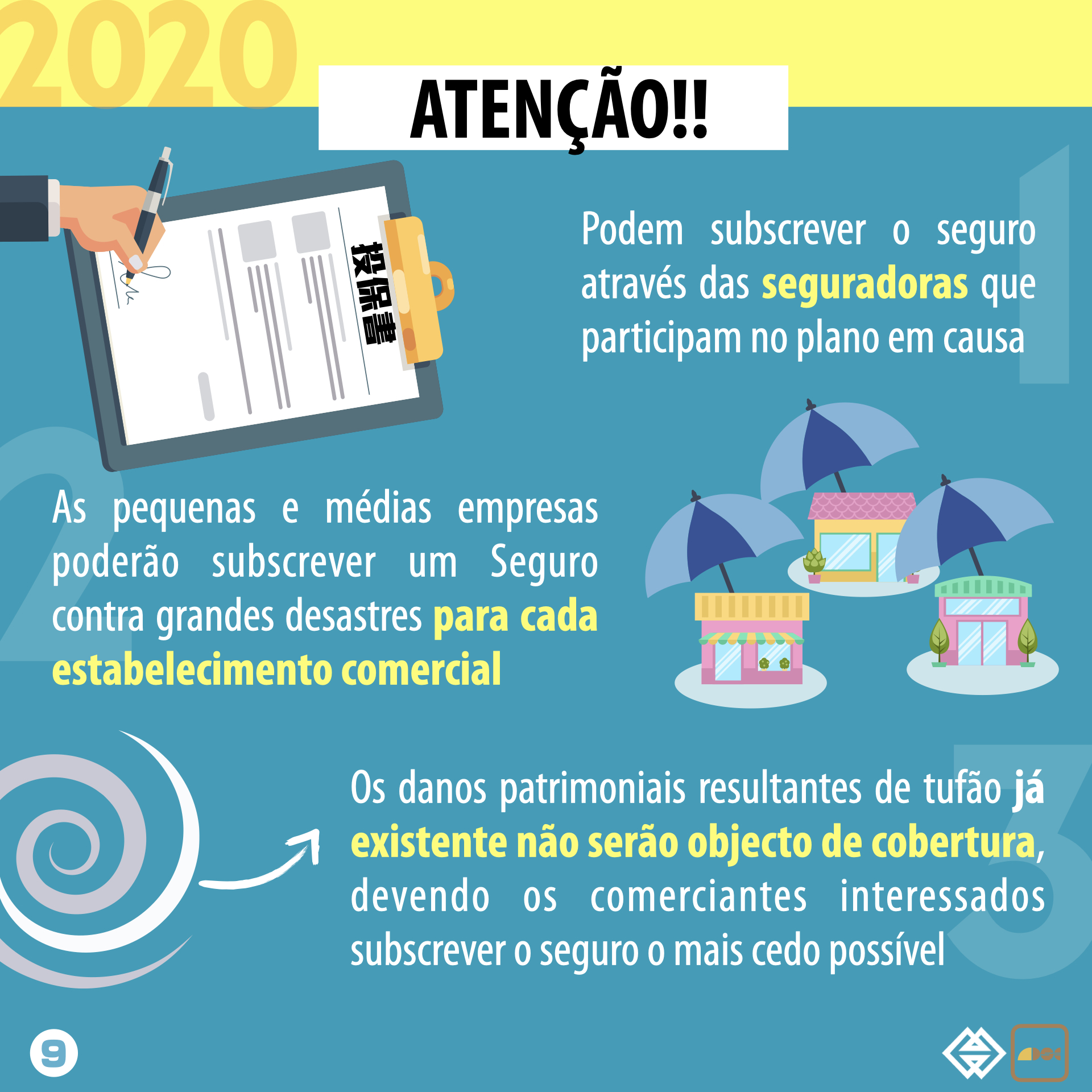 A subscrição do “Seguro de bens patrimoniais contra grandes desastres para as pequenas e médias empresas” (adiante designado por “Seguro contra grandes desastres”) e a apresentação do pedido do “Plano de apoio financeiro a conceder no âmbito do seguro de bens patrimoniais contra grandes desastres para as pequenas e médias empresas” (adiante designado por “Plano de apoio financeiro”) para o Ano 2020 serão aceites a partir de amanhã (6 de Julho) até 31 de Dezembro do ano corrente. No novo plano de seguro, serão excluídos a franquia e o limite máximo de indemnização das mercadorias, concedendo um desconto de prémio às empresas que nunca apresentaram pedidos de indemnização aquando da renovação de seguro, continuando a facultar medidas de apoio financeiro do prémio, de modo a promover a popularização do seguro em causa, tendo presentes as necessidades das pequenas e médias empresas de Macau.