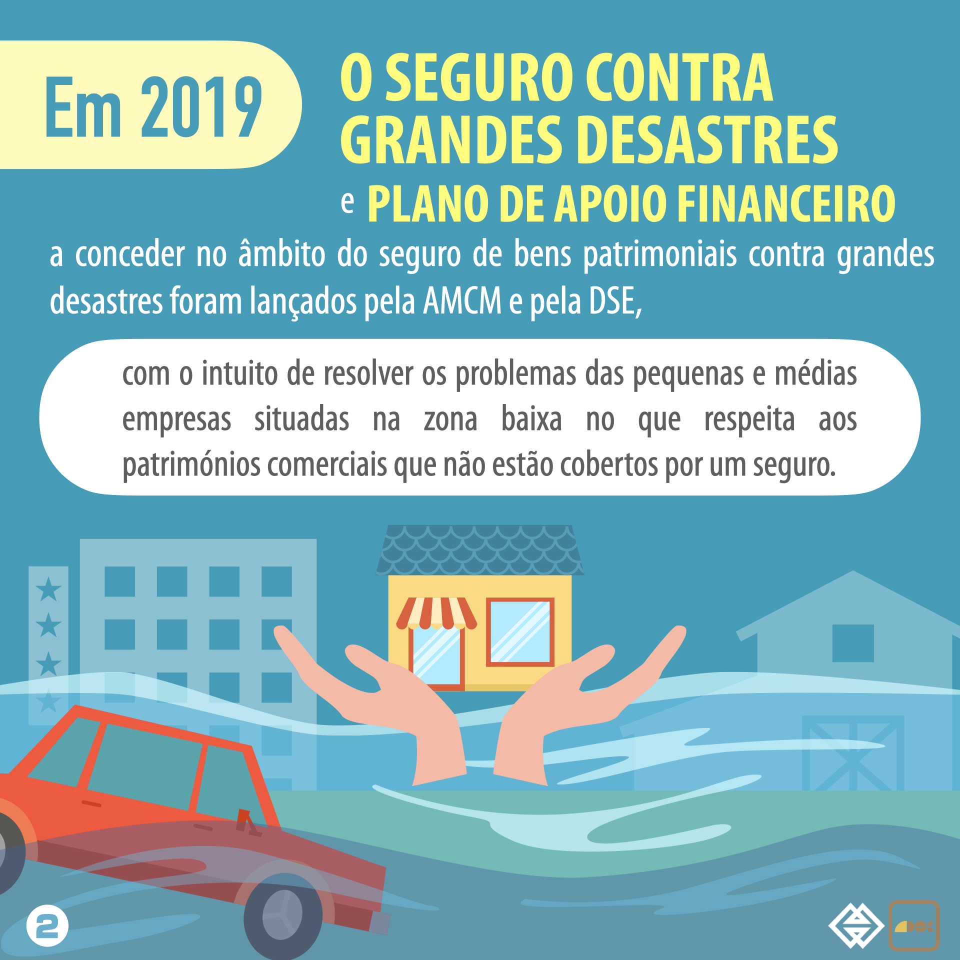 O “Seguro contra grandes desastres” e o “Plano de apoio financeiro” foram lançados, em Agosto de 2019, pela Autoridade Monetária de Macau (AMCM) e pela Direcção dos Serviços de Economia (DSE), visando a resolver os problemas das pequenas e médias empresas situadas na zona baixa no que respeita aos patrimónios comerciais que não estão cobertos por um seguro, durante o período de tufões fortes e «Storm Surge ». O “Seguro contra grandes desastres” será subscrito, mediante uma apólice uniforme, com cobertura de prejuízos patrimoniais de natureza comercial, causados pela tempestade tropical Sinal n.o 8 ou superior de ou «Storm Surge» Nível 4 (vermelho) ou superior, concedendo ainda apoio financeiro às pequenas e médias empresas qualificadas. A subscrição do seguro de natureza comercial, com base no modelo de orientação concluído pelo governo, em funcionamento no mercado e participado pelas empresas e através de apoios financeiros condicionais do governo, permite que o papel do mecanismo do mercado na repartição de riscos de desastre seja desempenhado. Até finais de 2019, foram emitidas 19 apólices e concedidos os respectivos apoios financeiros, entre os sectores que subscreveram o seguro em causa, o sector de restauração representa a maior parte, logo a seguir são o sector de comércio a retalho, o de comércio por grosso de mariscos secos e o de comércio a retalho e por grosso de aparelhos electrodomésticos, etc.