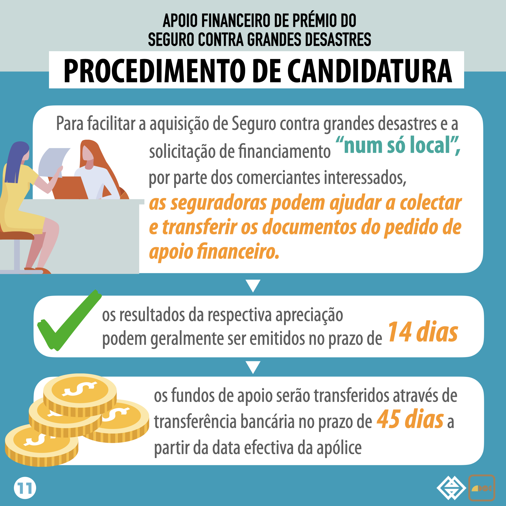 Para facilitar a aquisição de Seguro contra grandes desastres e a solicitação de financiamento, “num só local”, por parte dos comerciantes interessados, as seguradoras podem ajudar a colectar e transferir os documentos do pedido de apoio financeiro. Tendo em atenção a grande quantidade de pedidos de indemnização, após grandes desastres, as seguradoras procurarão acelerar os procedimentos com vista ao pagamento rápido das indemnizações.