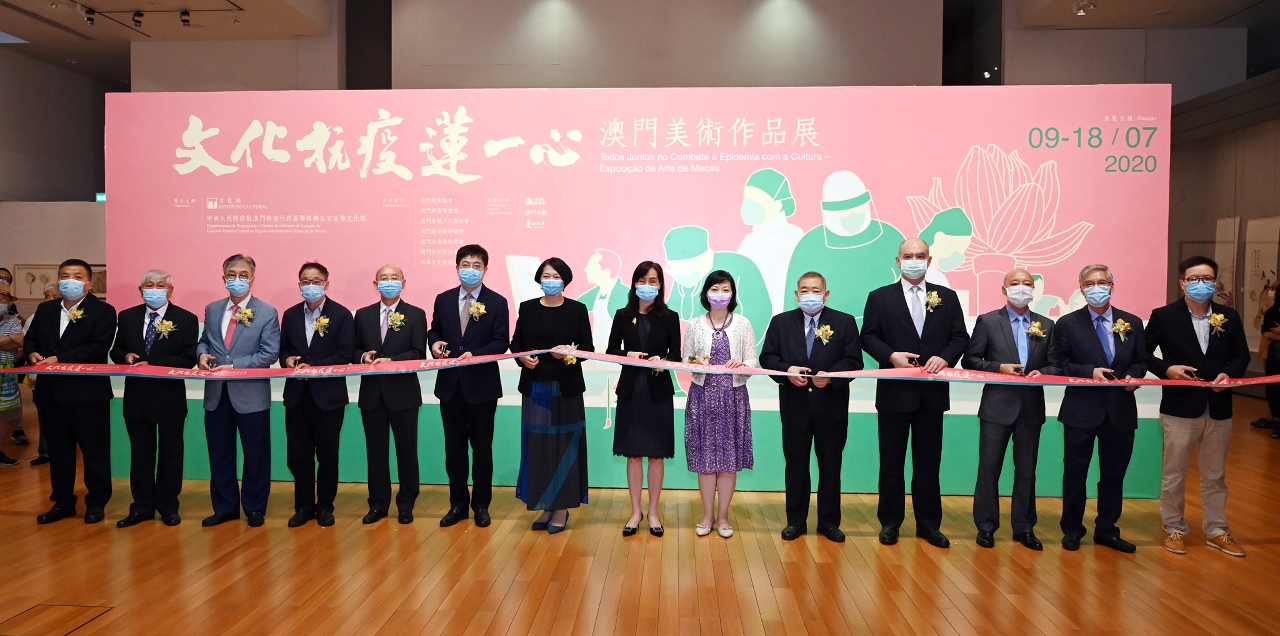 Co-organizado pelo Instituto Cultural (IC) e pelo Departamento de Propaganda e Cultura do Gabinete de Ligação do Governo Popular Central na Região Administrativa Especial de Macau, o evento “Todos Juntos no Combate à Epidemia com a Cultura - Exposição de Arte de Macau” foi inaugurado no dia 8 de Julho (Quarta-feira), pelas 18:30 horas, no Museu das Ofertas sobre a Transferência de Soberania de Macau. A cerimónia de inauguração foi presidida pela Secretária para os Assuntos Sociais e Cultura do Governo da Região Administrativa Especial de Macau, Ao Ieong U, pela Vice-directora do Gabinete de Ligação do Governo Popular Central na Região Administrativa Especial de Macau, Yan Zhichan; pela Presidente do Instituto Cultural do Governo da Região Administrativa Especial de Macau, Mok Ian Ian; pelo Director do Departamento de Propaganda e Cultura do Gabinete de Ligação do Governo Popular Central na Região Administrativa Especial de Macau, Wan Sucheng; pelo Presidente da Associação dos Calígrafos e Pintores Chineses Yu Un de Macau, Chui Sai Cheong; pelo Director do Jornal Macao Daily News, Lok Po; pelo Presidente da Comissão Executiva da TDM - Teledifusão de Macau, S.A., Manuel Pires; pelo Presidente da Associação de Mestres de Arte de Macau, Lai Ieng; pelo Presidente da Associação dos Artistas de Belas-Artes de Macau, Lok Hei; pelo Presidente da Associação de Incentivar Políticas da Humanidades de Sabedoria de Macau, Ng Choi Kun; pelo Presidente da Associação dos Calígrafos e Escultores de Selos de Macau, Sio Chun Un; pelo Presidente da Associação Cultural e Arte de Chong Fong, Sou Kan Leong; pelo Presidente da Associação de Arte a Tinta de Macau, Mak Lei; e pelo Presidente da Revista Art Review, Lao Fu Ip.