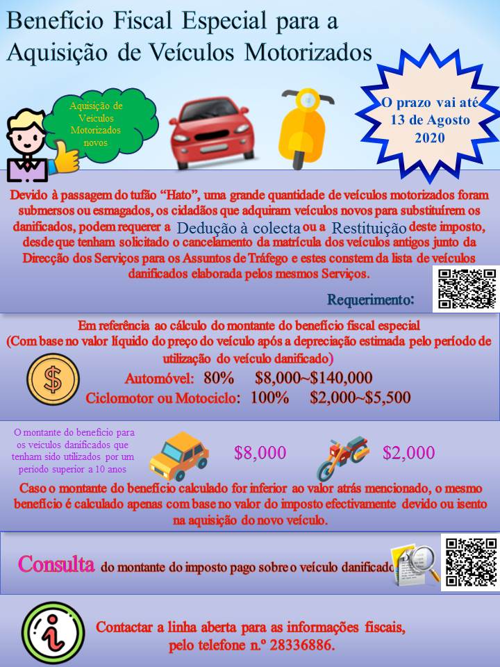 Durante a passagem do tufão “Hato” por Macau em 2017, uma grande quantidade de veículos motorizados foram submersos ou esmagados, por este motivo, o Governo da RAEM aprovou a Lei n.º 10/2018, intitulada “Benefício Fiscal Especial para a Aquisição de Veículos Motorizados”, que visa aliviar os encargos financeiros suportados pelos cidadãos resultantes da aquisição de veículos motorizados novos. Os cidadãos que adquiram veículos novos para substituírem os antigos podem requerer a dedução ou a restituição do imposto sobre veículos motorizados, desde que tenham solicitado o cancelamento da matrícula dos veículos antigos junto da Direcção dos Serviços para os Assuntos de Tráfego e estes constem da lista de veículos danificados elaborada pelos mesmos Serviços.