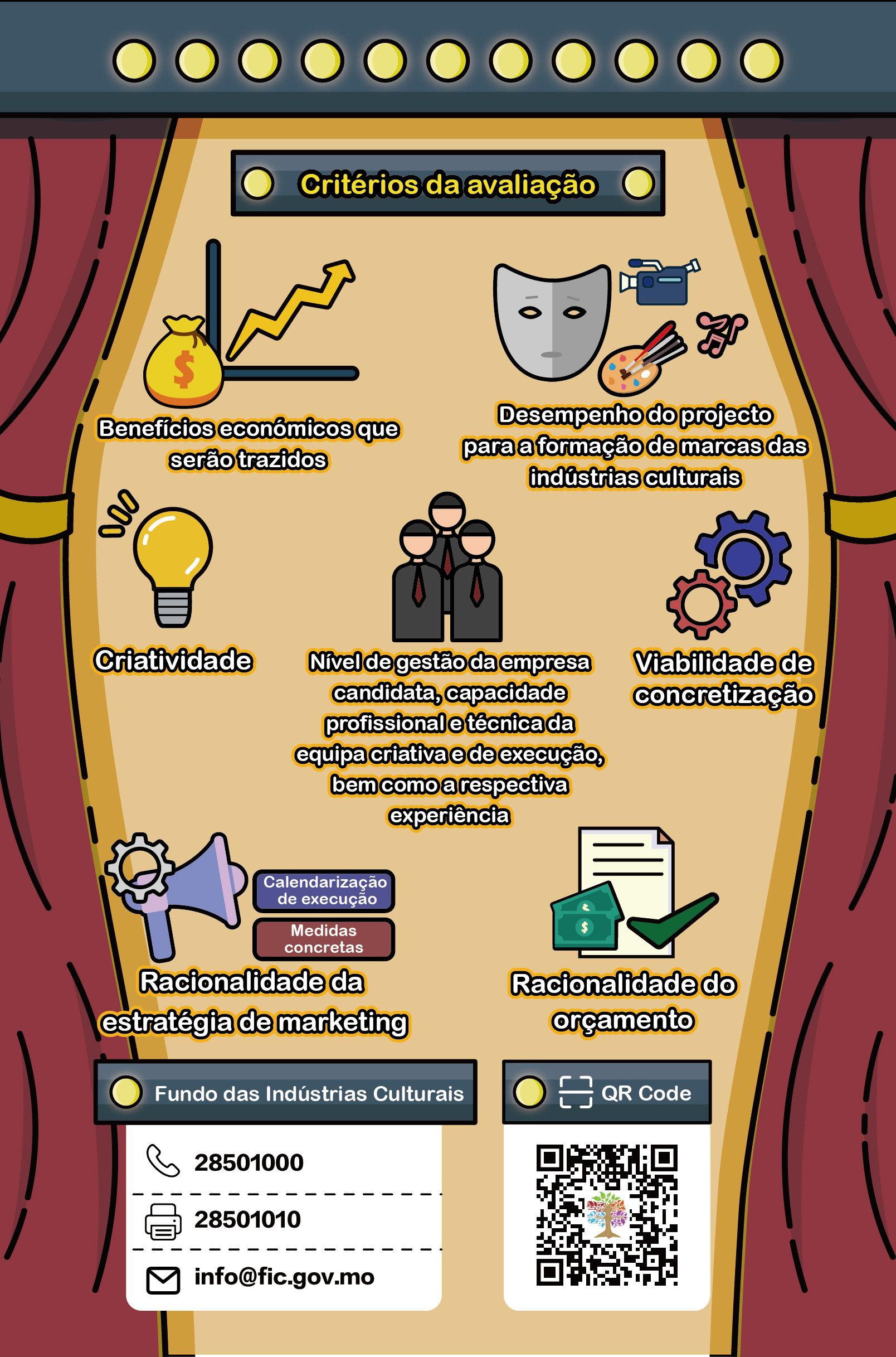 O FIC irá admitir os projectos candidatos por forma de selecção, no total de 10 projectos concedidos, com o período de execução do projecto de 18 meses. O limite de apoio financeiro é de 90% do custo total do projecto, sendo o limite máximo de MOP800 mil. Os âmbitos para a utilização das verbas de apoio financeiro incluem: despesas em recursos humanos (criadores, actores e técnicos); renda do espaço para a realização de exposições e espectáculos; despesas de cenografia, adereços e vestidos, equipamentos de iluminações e de sonares, construção e desmontagem de palco; despesas de divulgação e promoção; despesas de transporte dos actores e dos trabalhadores (especificação designada); despesas de produção de produtos derivados; despesas de logística e de auditoria/contabilidade. O FIC irá prestar apoio financeiro na forma de pagamento de despesas efectivas, devendo as verbas de apoio financeiro ser geridas através de conta bancária específica fechada, sujeitando-se à auditoria de companhia auditora, no sentido de assegurar que o erário público seja eficientemente aplicado. As empresas interessadas podem descarregar o Boletim de Candidatura na página electrónica (www.fic.gov.mo). Para quaisquer dúvidas, queira consultar através do n.º de telefone 2850 1000 ou por e-mail (info@fic.gov.mo).