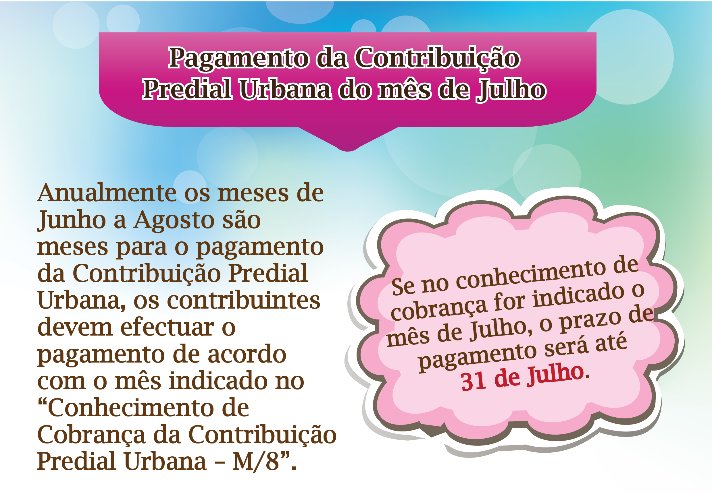 A Direcção dos Serviços de Finanças vem lembrar os contribuintes que receberam conhecimentos de cobrança da Contribuição Predial Urbana, respeitantes ao ano de 2019, com indicação do prazo de pagamento em Julho, que o respectivo prazo limite termina no próximo dia 31 de Julho. Para evitar perdas de tempo de espera ou o pagamento adicional de juros de mora e multa, devido ao pagamento fora do prazo, esta Direcção de Serviços apela aos contribuintes que ainda não o fizeram para efectuarem o respectivo pagamento com a maior brevidade possível, por meio das formas de pagamento disponibilizadas pelos Serviços de Finanças, podendo ainda fazê-lo dentro das horas de expediente, nos balcões dos Bancos indicados ou nas Recebedorias instaladas, respectivamente, no Edifício “Finanças”, no Edifício “Long Cheng”, no Centro de Serviços da RAEM e no Centro de Serviços da RAEM das Ilhas. Por forma a facilitar o pagamento, os contribuintes podem, com a utilização do respectivo Bilhete de Identidade de Residente da RAEM, imprimir nos diversos quiosques os dados sumários do conhecimento de cobrança, a fim de efectuarem o pagamento nas máquinas ATM e através do banco por transacção electrónica, ou, imprimir a 2.ª via do conhecimento de cobrança, apenas disponível nos quiosques da DSF, instalados nos seguintes locais: