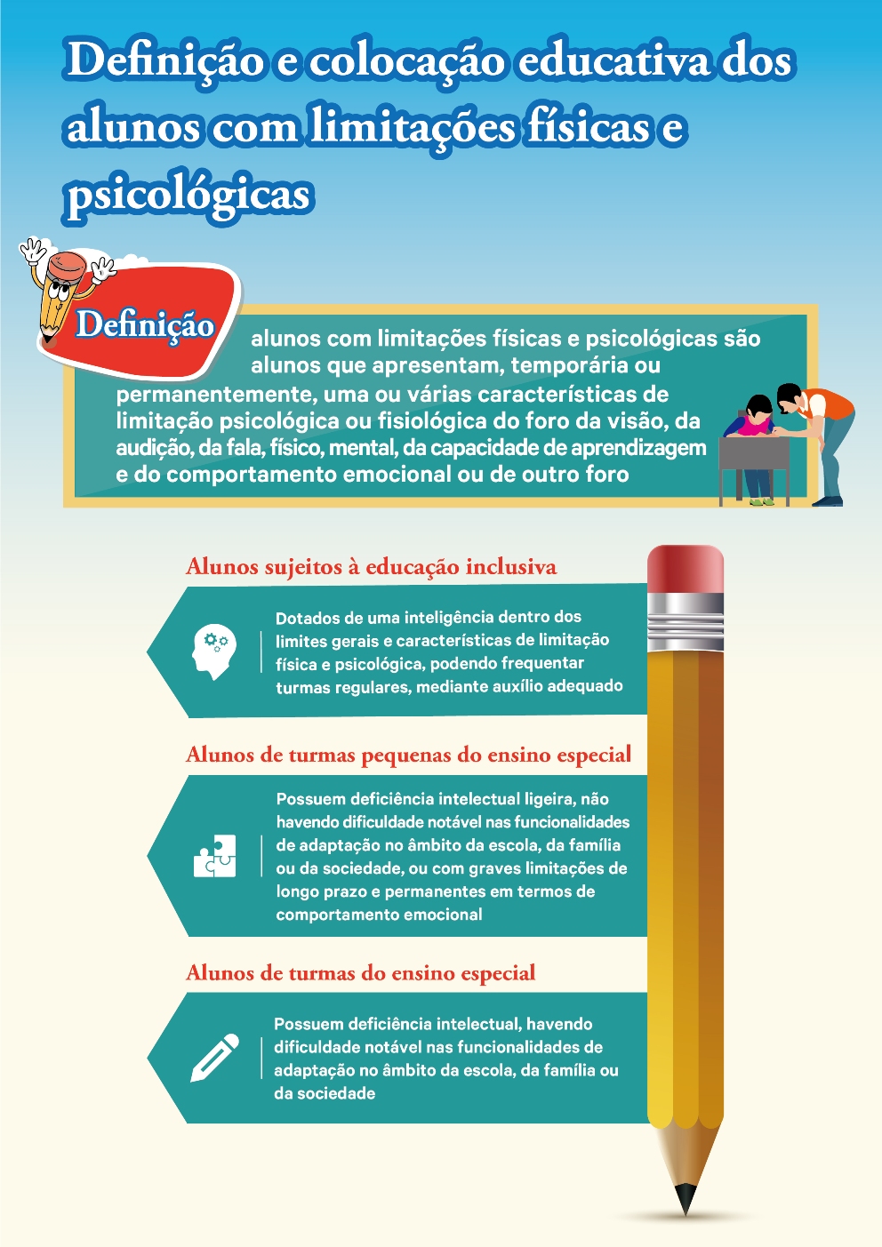 Em relação aos alunos com limitações físicas e mentais, o diploma legal divide-os em três tipos de alunos: alunos sujeitos à educação inclusiva, alunos de turmas pequenas do ensino especial e alunos das turmas do ensino especial. Os alunos sujeitos à educação inclusiva frequentam as turmas regulares; as turmas pequenas do ensino especial podem ser criadas nos diversos níveis de ensino das escolas regulares ou das escolas de ensino especial; as turmas do ensino especial podem ser criadas em todos os níveis de ensino, sendo a colocação dos alunos feita de acordo com a respectiva idade. Os objectivos curriculares, para os alunos sujeitos à educação inclusiva, são basicamente iguais aos da educação regular, enquanto os currículos das turmas pequenas do ensino especial têm o propósito de possibilitar, aos alunos, a aquisição de conhecimentos, e o desenvolvimento das capacidades e das atitudes fundamentais, factores imprescindíveis para que os mesmos se possam dedicar a determinada profissão. Os currículos das turmas do ensino especial, por sua vez, visam cultivar, nos alunos, a capacidade de viver autonomamente, competências técnico-profissionais e atitudes básicas. No diploma legal foi, também, definido o conceito de “aluno sobredotado” e regulamentado que os alunos sobredotados devem frequentar as turmas dos diversos níveis de ensino da educação regular; além disso, foram também regulamentados os currículos e os certificados destes alunos, bem como o desenvolvimento da educação para alunos sobredotados.