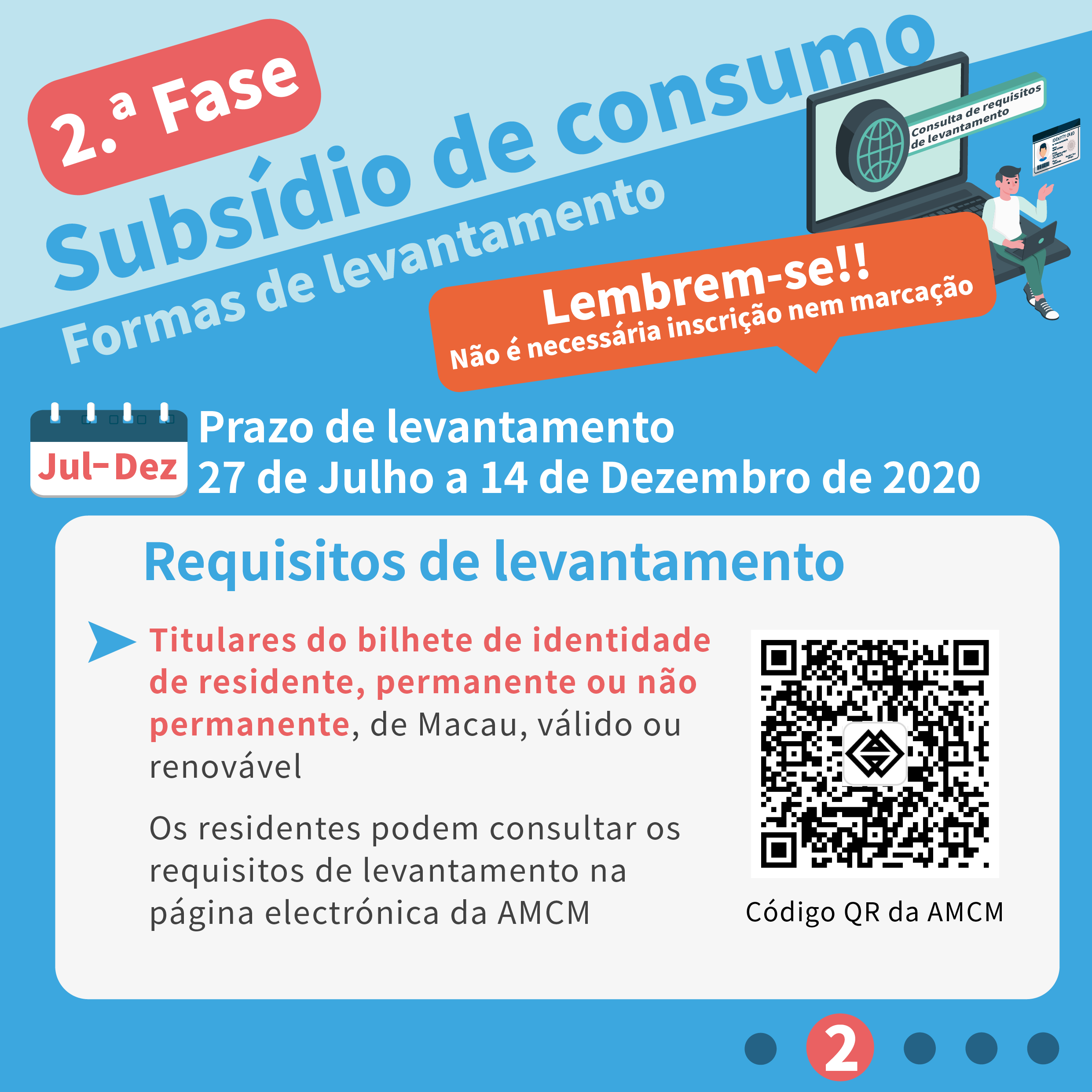 A Autoridade Monetária de Macau (AMCM) já lançou o sistema de consulta sobre a 2ª fase do Plano, os residentes podem consultar neste sistema os requisitos de levantamento e o estado do cartão de consumo electrónico, através da inserção do número do bilhete de identidade e da data de nascimento. A página exclusiva é a seguinte: