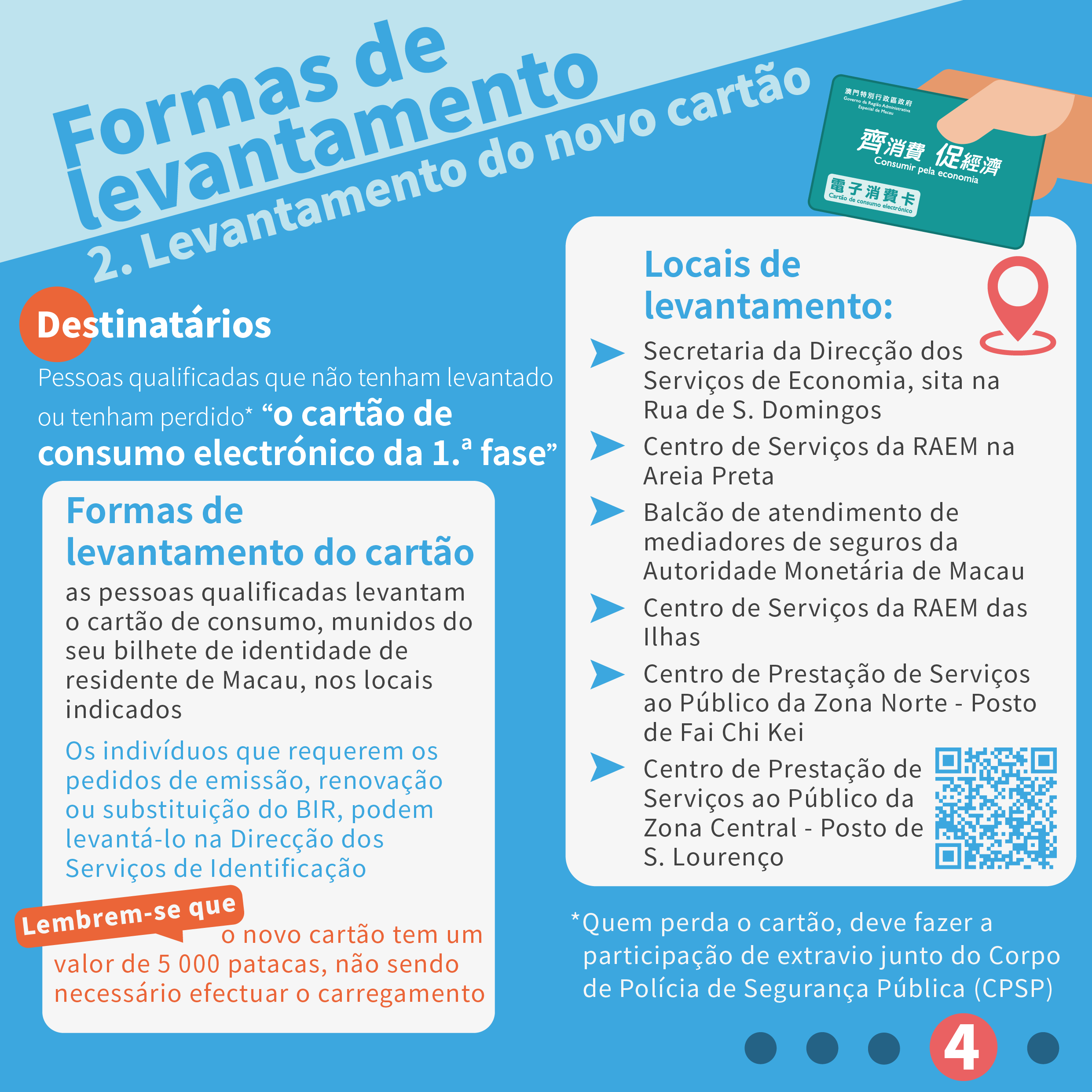 As pessoas qualificadas que não tenham levantado ou tenham perdido o cartão de consumo podem, não necessitando da inscrição nem marcação prévia, levantar o cartão de consumo pré-carregado com 5000 patacas, munidas do seu bilhete de identidade, pessoalmente ou através do seu representante, nos indicados postos de serviços distribuídos nos serviços públicos. Os residentes que tenham perdido o cartão da 1ª fase devem fazer a participação de extravio junto do Corpo de Polícia de Segurança Pública, antes de levantar o cartão da 2ª fase.