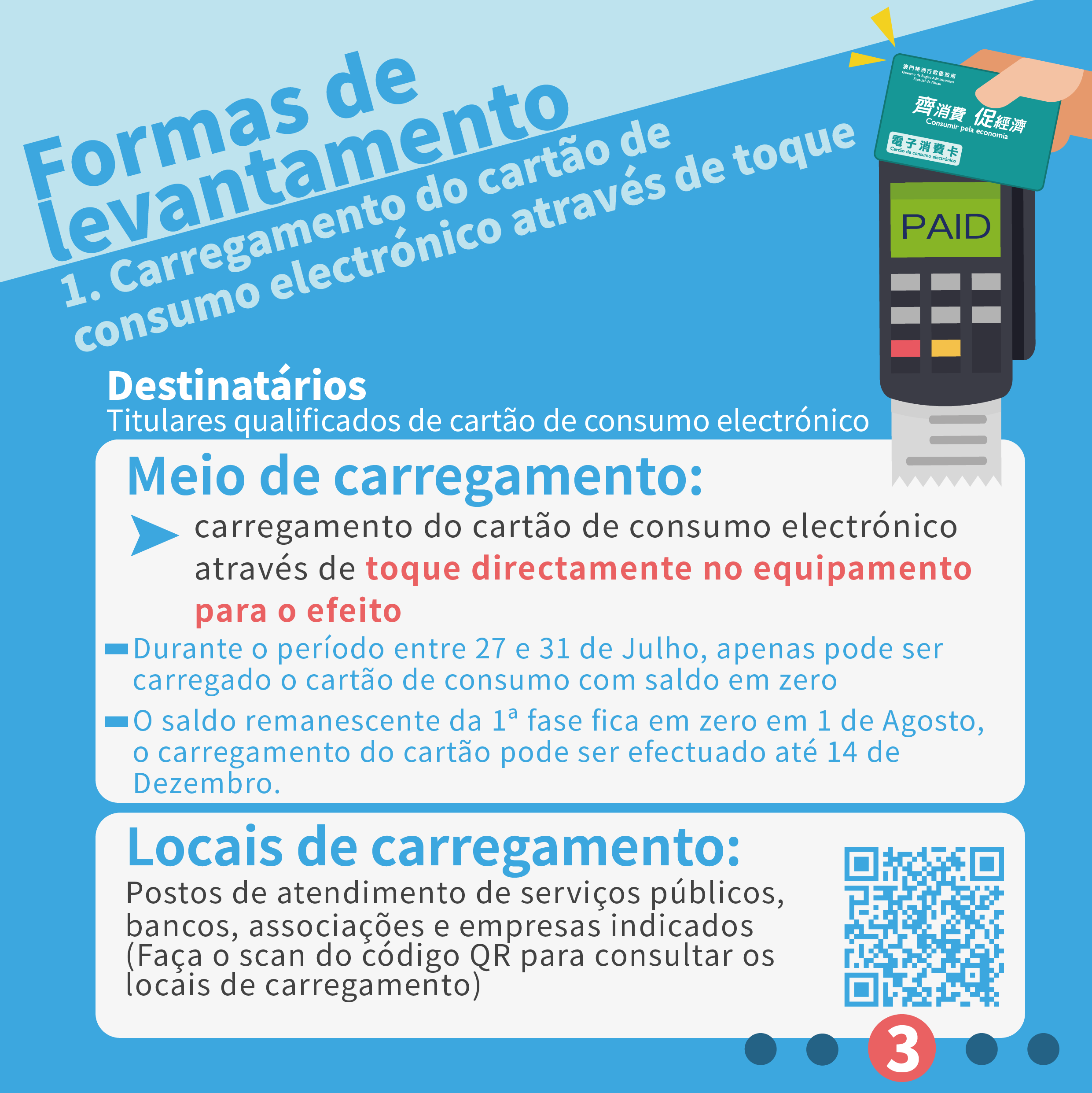 Chama-se a atenção de que durante o período entre 27 e 31 de Julho, apenas pode ser carregado o cartão de consumo com saldo zero. O prazo de utilização do cartão de consumo da 1ª fase terminará no próximo dia 31 de Julho, sendo o saldo remanescente não utilizado neste período reposto nos cofres do Tesouro. O saldo remanescente de todos os cartões da 1ª fase ficará em zero em 1 de Agosto, podendo, a partir daquele dia, ser carregado o cartão nos postos automáticos.