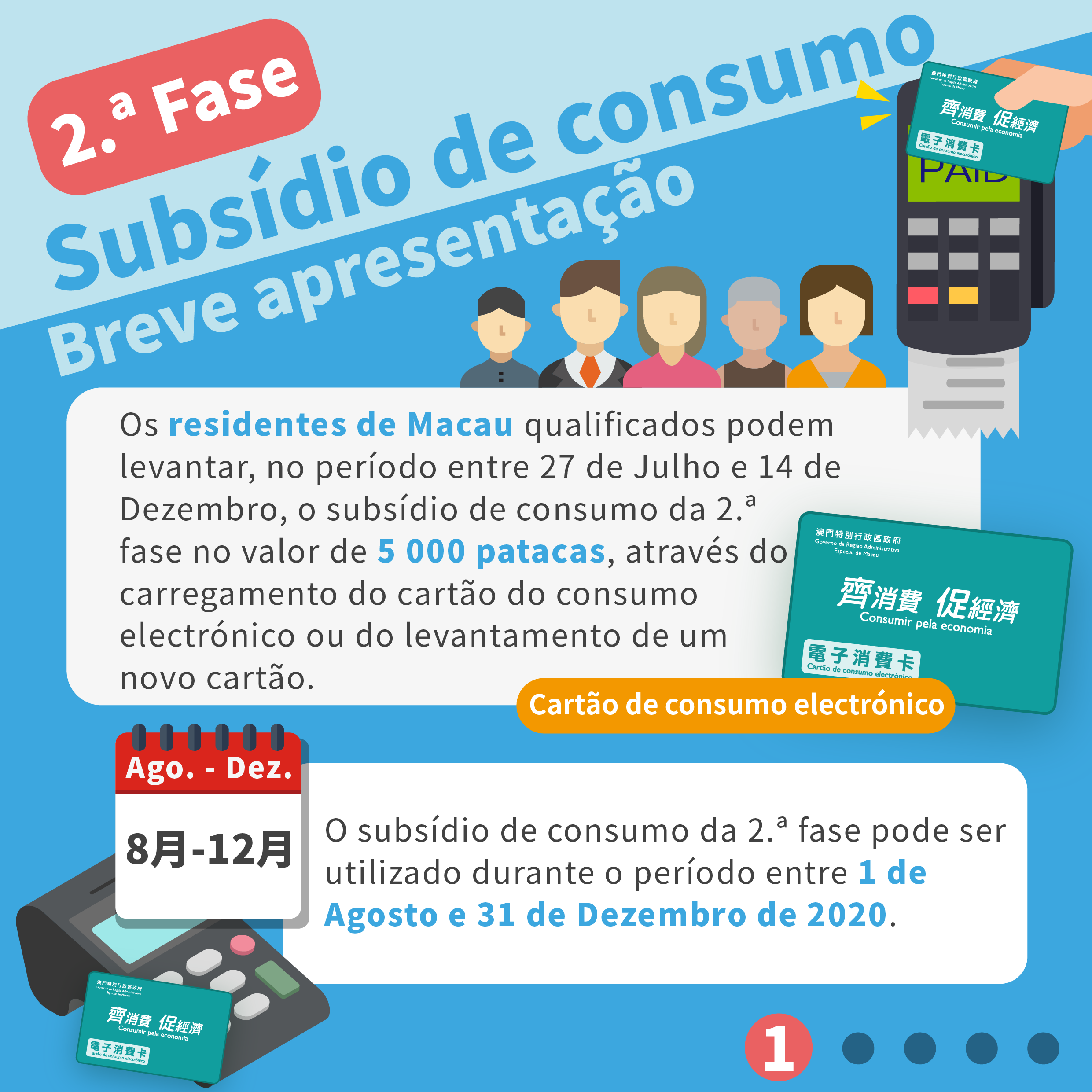 A “Segunda fase do plano de subsídio de consumo” (cartão de consumo electrónico), doravante designado por Plano, será implementada no período entre 1 de Agosto e 31 de Dezembro. Os destinatários continuam a ser os titulares do bilhete de identidade de residente permanente de Macau ou do bilhete de identidade de residente não permanente de Macau, válido ou renovável, sendo atribuído a cada residente um subsídio de consumo no valor de 5000 patacas.