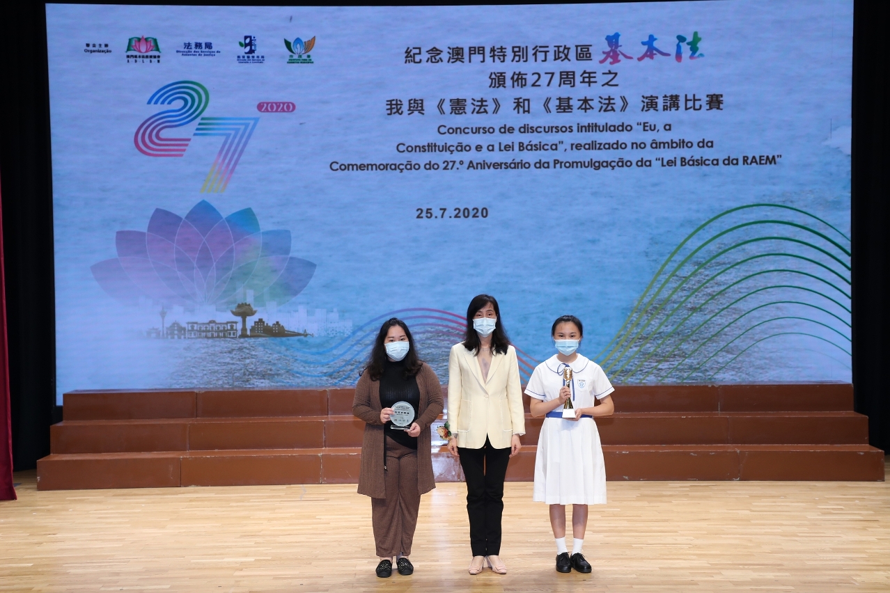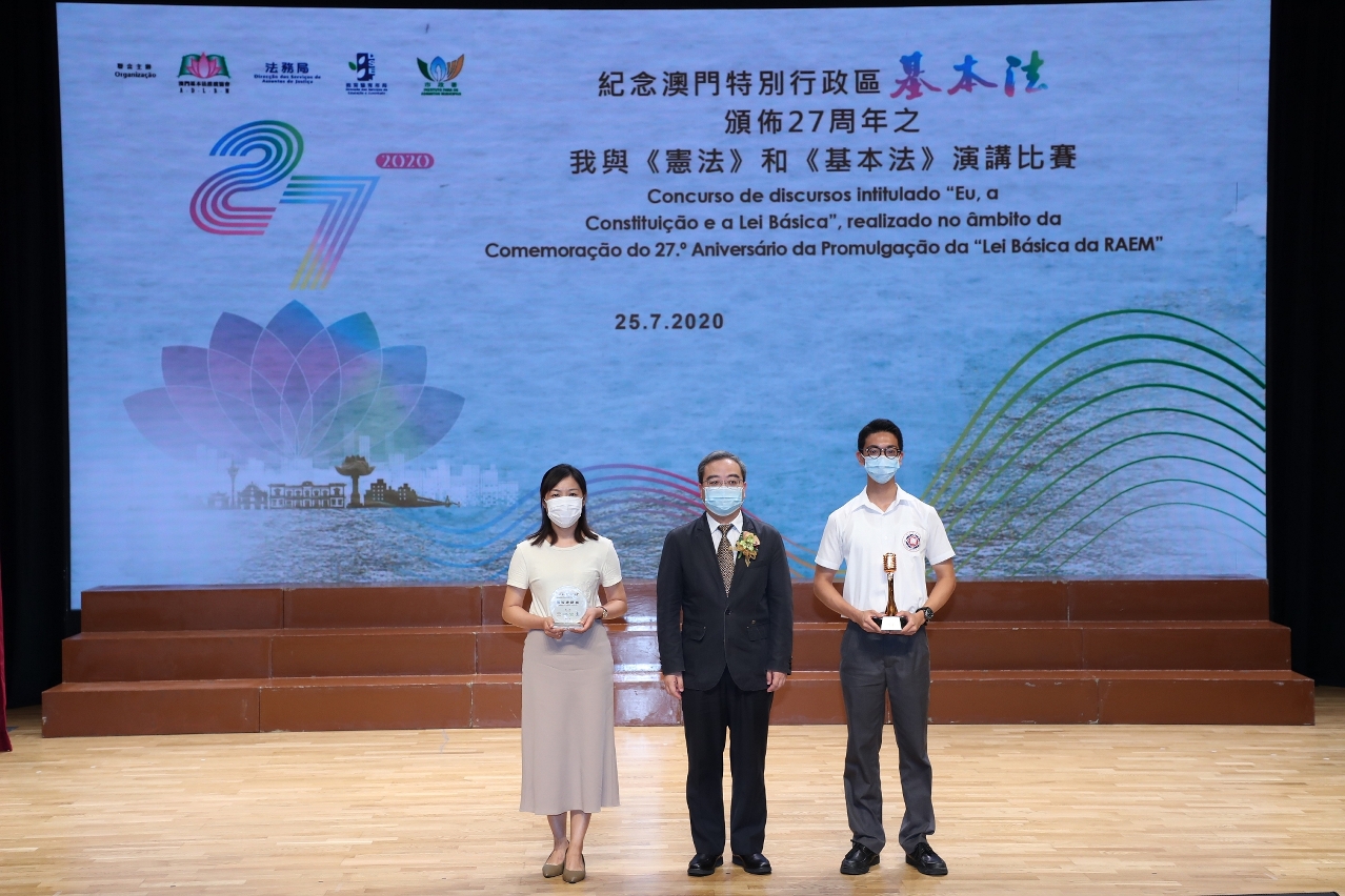 A fim de continuar a promover a Constituição e a Lei Básica junto dos jovens, foi realizada com sucesso, no dia 25 de Julho, a fase final do Concurso de discursos “Eu, a Constituição e a Lei Básica”, realizado no âmbito da Comemoração do 27.º Aniversário da Promulgação da “Lei Básica da RAEM”, no auditório da Escola Luso-Chinesa Técnico-Profissional. O Concurso foi organizado, conjuntamente, pela Direcção dos Serviços de Educação e Juventude, pela Associação de Divulgação da Lei Básica de Macau, pela Direcção dos Serviços de Assuntos de Justiça e pelo Instituto para os Assuntos Municipais.