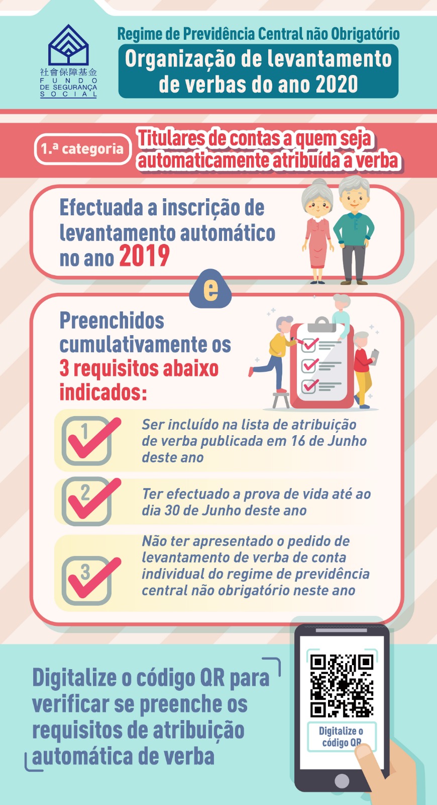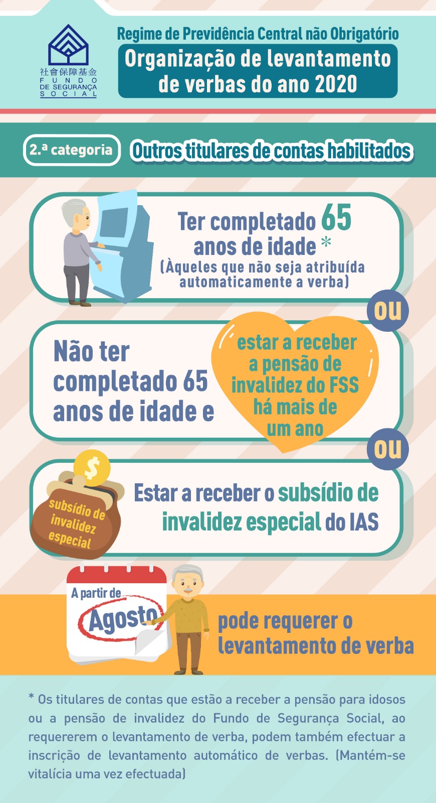 Para facilitar os idosos no levantamento da verba atribuída pelo Governo, o Fundo de Segurança Social (FSS) lançou no ano passado a medida de "inscrição de levantamento automático de verbas a título de repartição extraordinária de saldos orçamentais do regime de previdência central não obrigatório", registou-se um total de 54.000 idosos que efectuaram a inscrição e preencheram os requisitos de atribuição automática de verbas deste ano, estes vão receber a respectiva verba no dia 21 de Agosto, sem necessidade de tratar de quaisquer formalidades, e serão notificados por SMS ou por ofício no final de Julho.