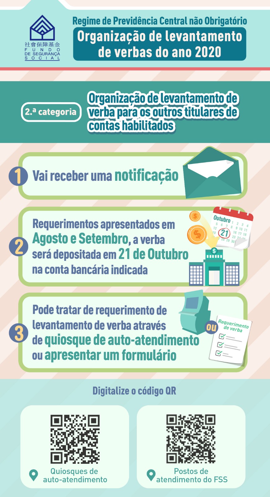 Os restantes 20 mil titulares da conta que preenchem os requisitos de levantamento de verba (Idosos com idade igual ou superior a 65 anos a quem não tenham sido automaticamente atribuída a verba / Não tenham completado 65 anos de idade e estejam a receber a pensão de invalidez do FSS há mais de um ano / Estejam a receber o subsídio de invalidez especial do IAS), vão receber sucessivamente uma notificação de levantamento de verba na primeira metade de Agosto, podendo tratar do requerimento de levantamento de verba através dos quiosques de auto-atendimento ou deslocar-se pessoalmente aos seguintes postos de atendimento: