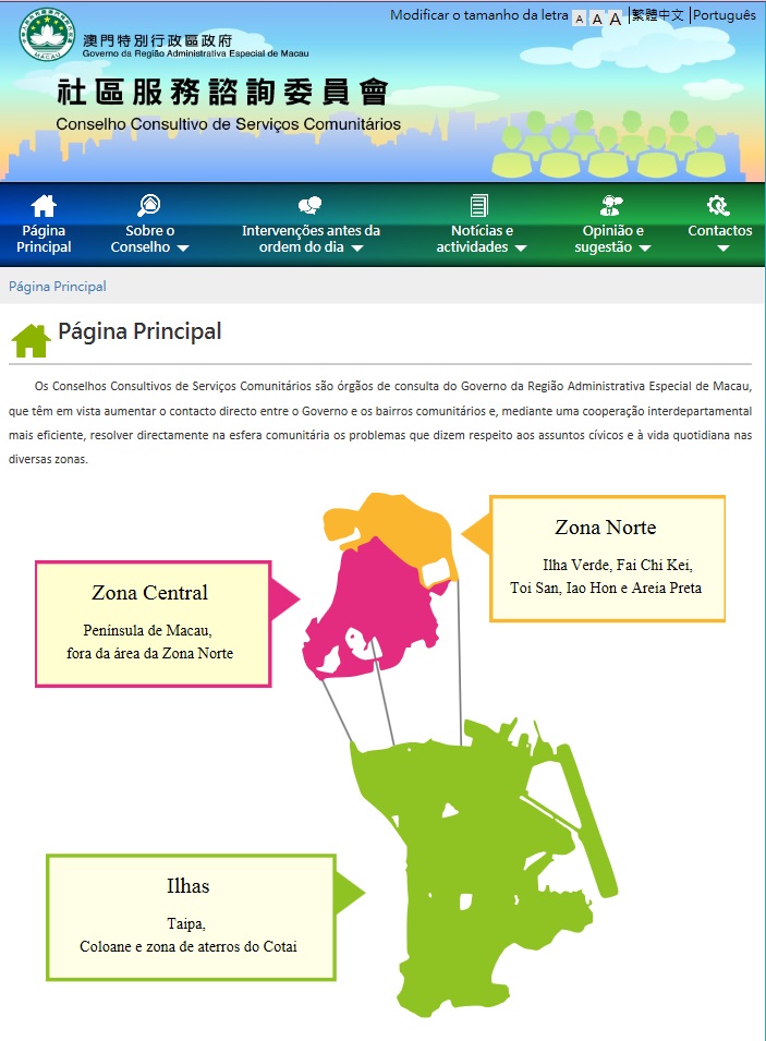 Além disso, também podem ser consultadas na página em causa as informações básicas do CCSC, nomeadamente a fundamentação jurídica da sua criação, a lista dos membros do CCSC nas três zonas, o conteúdo de actividades, os dados de contacto, entre outras. Espera-se que os cidadãos estejam atentos a esta página e entendam, assim, os temas comunitários que merecem preocupação nas sessões ordinárias mensais do CCSC nas três zonas e a resposta e acompanhamento apresentados pelos Serviços Públicos. Não hesite em apresentar ao CCSC as suas valiosas sugestões ou opiniões sobre os assuntos comunitários dos bairros abrangidos, para fortalecer a comunicação entre os cidadãos e o Governo.