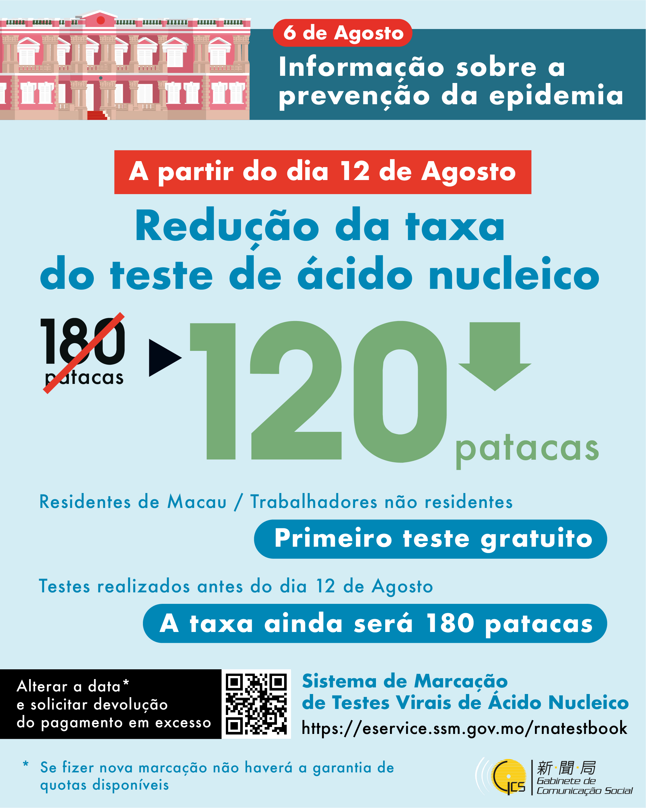 【Infografia】Taxa do teste de ácido nucleico reduzida para 120 patacas a partir do dia 12 de Agosto