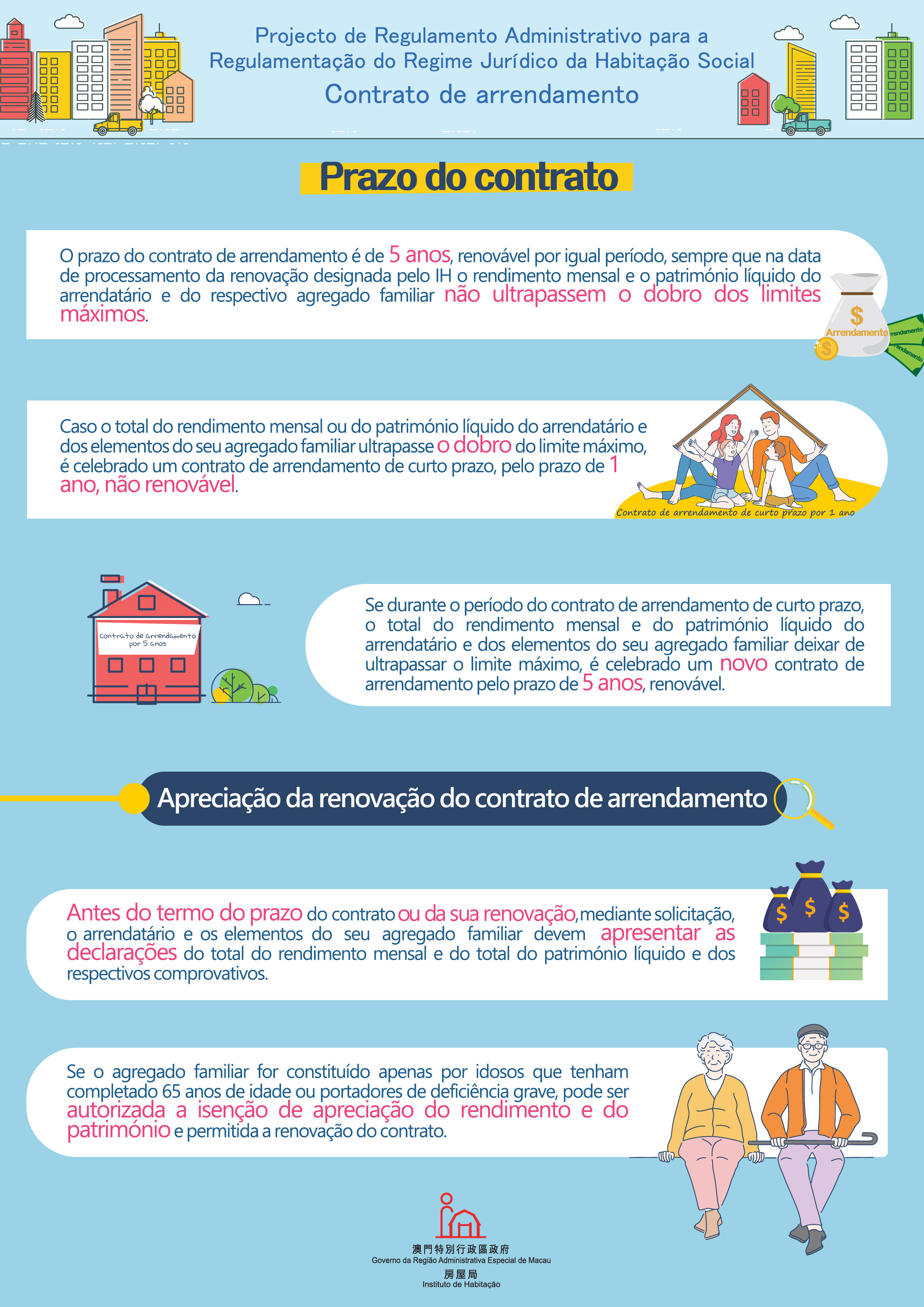 O arrendamento de habitação social. O contrato de arrendamento de habitação social é de 5 anos, renovável por iguais períodos, sempre que na data de processamento da renovação o total do rendimento mensal e do património líquido do arrendatário e do respectivo agregado familiar não ultrapassem o dobro dos limites máximos; caso ultrapassem o dobro do limite máximo, será celebrado um contrato de arrendamento de curto prazo, pelo prazo de 1 ano, não renovável; se durante o período do contrato de arrendamento de curto prazo, deixar de ultrapassar o limite máximo, é celebrado um novo contrato de arrendamento pelo prazo de 5 anos, renovável. O valor da renda é calculado de acordo com uma fórmula e os valores dos parâmetros da fórmula são fixados por despacho do Chefe do Executivo.