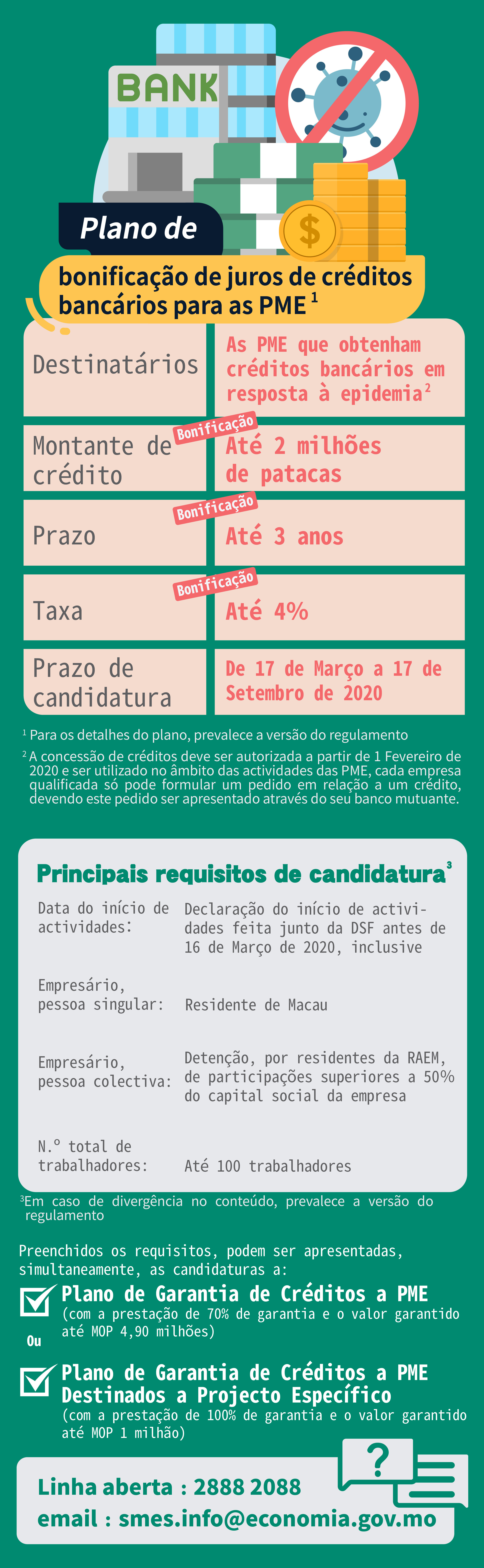 Para reforçar a liquidez das PME, o Governo da RAEM lançou o Plano de Bonificação de Juros de Créditos Bancários para as Pequenas e Médias Empresas, de carácter provisório, no sentido de reduzir os encargos com os juros das PME ao obterem créditos bancários para dar resposta à epidemia, através da concessão da bonificação de juros até 4% ao crédito no montante máximo de 2 milhões de patacas com prazo máximo de bonificação de 3 anos. Desde o lançamento do plano em 17 de Março até 15 de Agosto, foram recebidos 4 598 pedidos, dos quais 4 069 (aprox. 89%) foram aprovados, com montante dos créditos bancários bonificados em cerca de 5 210 milhões de patacas, envolvendo juros bonificados no valor de cerca de 320 milhões de patacas.