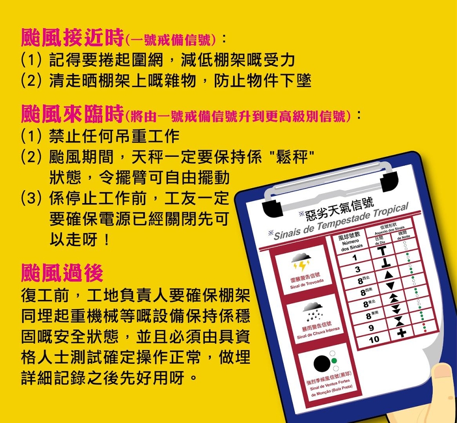 Por outro lado, os empreiteiros devem tomar medidas de prevenção nos estaleiros de obras antes da aproximação dos tufões ou do mau tempo, nomeadamente prevenção da queda de andaimes e de máquinas de elevação. Antes do reinício dos trabalhos nos estaleiros de obras de construção após a passagem do tufão e do mau tempo, devem ainda serem fiscalizados e examinados de forma abrangente os estaleiros, avaliando a segurança das máquinas, dos andaimes, dos equipamentos eléctricos, entre outros, para garantir que os trabalhadores tenham um ambiente de trabalho seguro.