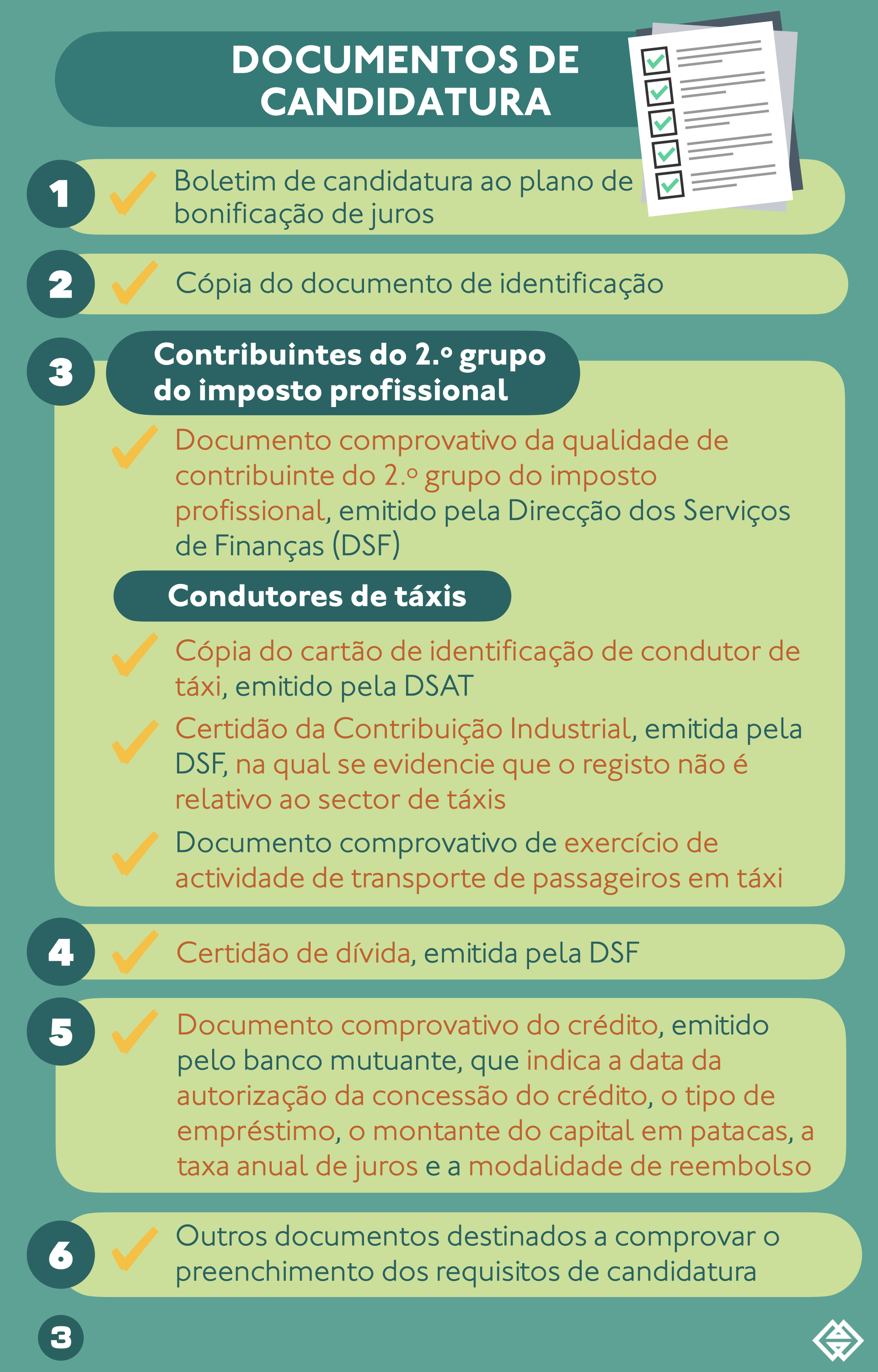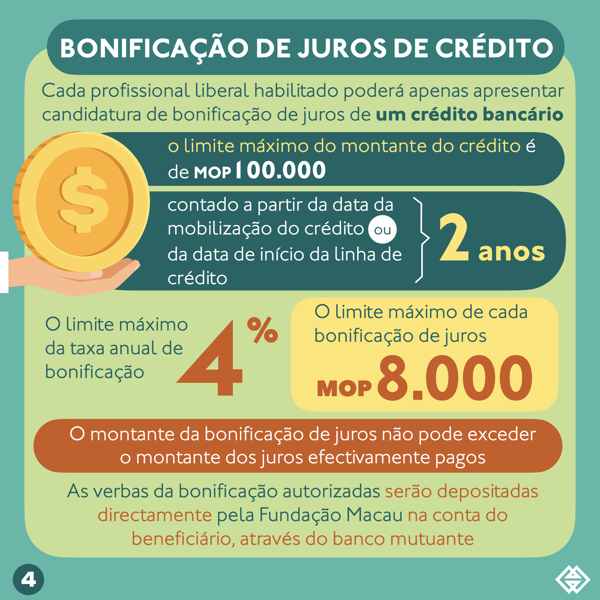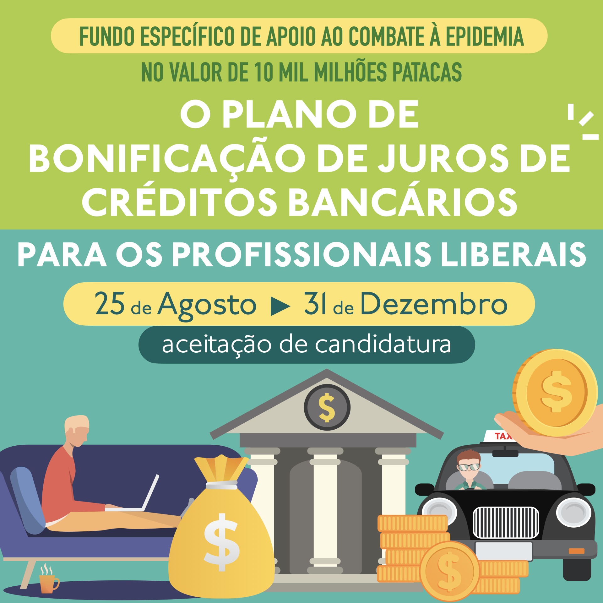 “O Plano de bonificação de juros de créditos bancários para os profissionais liberais” é uma das medidas do “Fundo específico de apoio ao combate à epidemia no valor de 10 mil milhões patacas”, o qual visa auxiliar os profissionais liberais a enfrentar as dificuldades económicas, bem como reduzir as suas pressões financeiras. Os requerentes devem apresentar cópia do documento de identificação, documento comprovativo da sua profissão, certidão de dívida, emitida pela Direcção dos Serviços de Finanças, bem como o documento comprovativo do crédito, emitido pelo banco mutuante, etc.