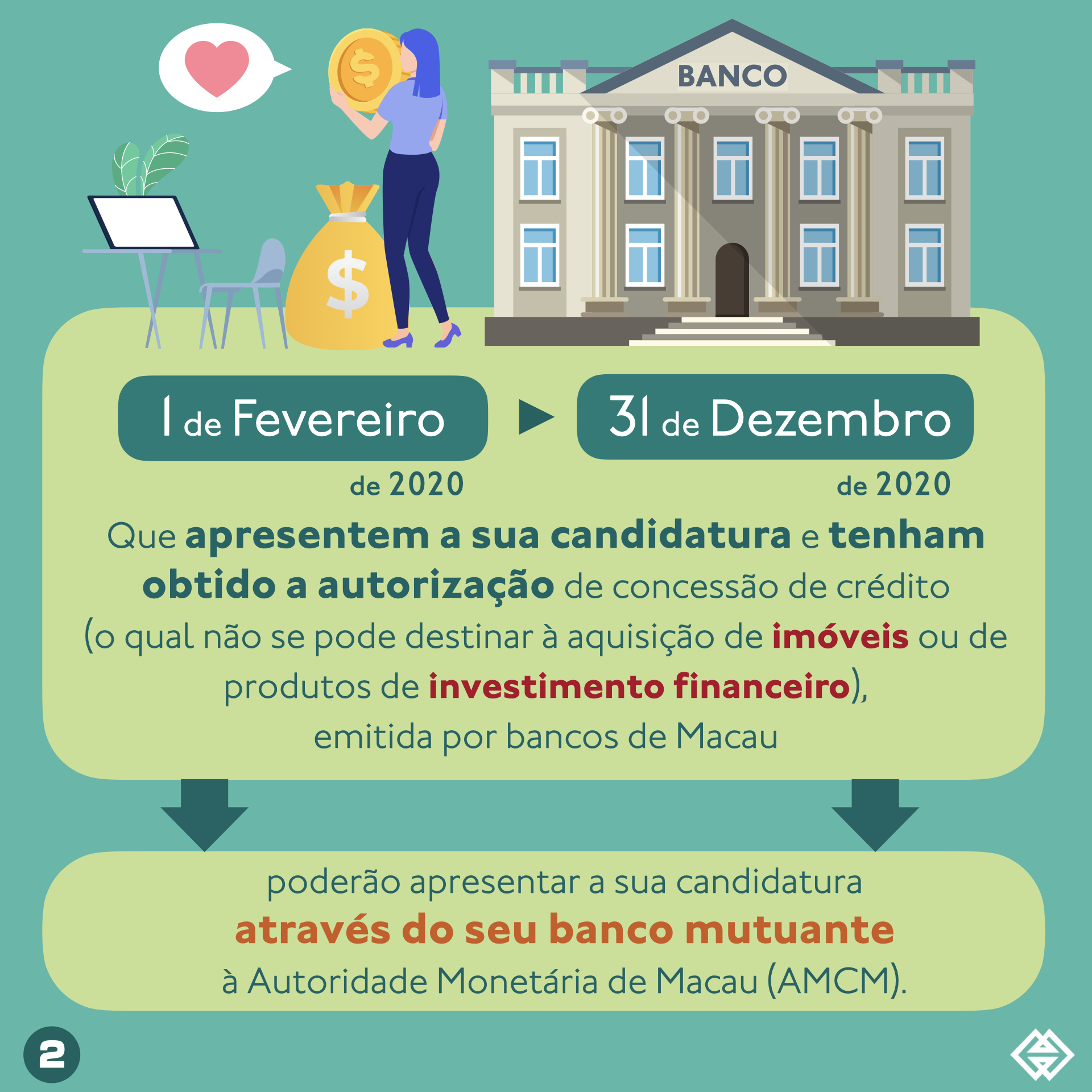 Nos termos do respectivo regulamento administrativo, os residentes de Macau que não se encontrem em dívida para com o Governo da RAEM e tenham obtido a autorização de concessão de crédito (o qual não se pode destinar à aquisição de imóveis ou de produtos de investimento financeiro), emitida no período compreendido entre 1 de Fevereiro e 31 de Dezembro de 2020, por bancos de Macau, poderão apresentar a sua candidatura através do seu banco mutuante à Autoridade Monetária de Macau (AMCM). No momento da candidatura, os requerentes devem ser contribuintes do 2.o grupo do imposto profissional ou portadores de cartão de identificação de condutor de táxi, emitido pela Direcção dos Serviços para os Assuntos de Tráfego, que comprove que se encontram a exercer a actividade de transporte de passageiros em táxi, excluindo os proprietários de táxis. Os requerentes poderão apresentar apenas candidatura à bonificação de juros de um crédito bancário, sendo o limite máximo do montante do crédito de cem mil patacas. O prazo máximo para a concessão da bonificação de juros autorizada é de dois anos, contado a partir da data da mobilização do crédito ou da data de início da linha de crédito. O limite máximo de cada bonificação é de oito mil patacas, não podendo o montante da bonificação de juros exceder o montante dos juros efectivamente pagos pelo requerente. As verbas da bonificação autorizadas serão depositadas directamente pela Fundação Macau na conta do beneficiário, através do banco mutuante. Prevê-se que o número de candidatos habilitados a este plano atinja cerca de 15.000 .