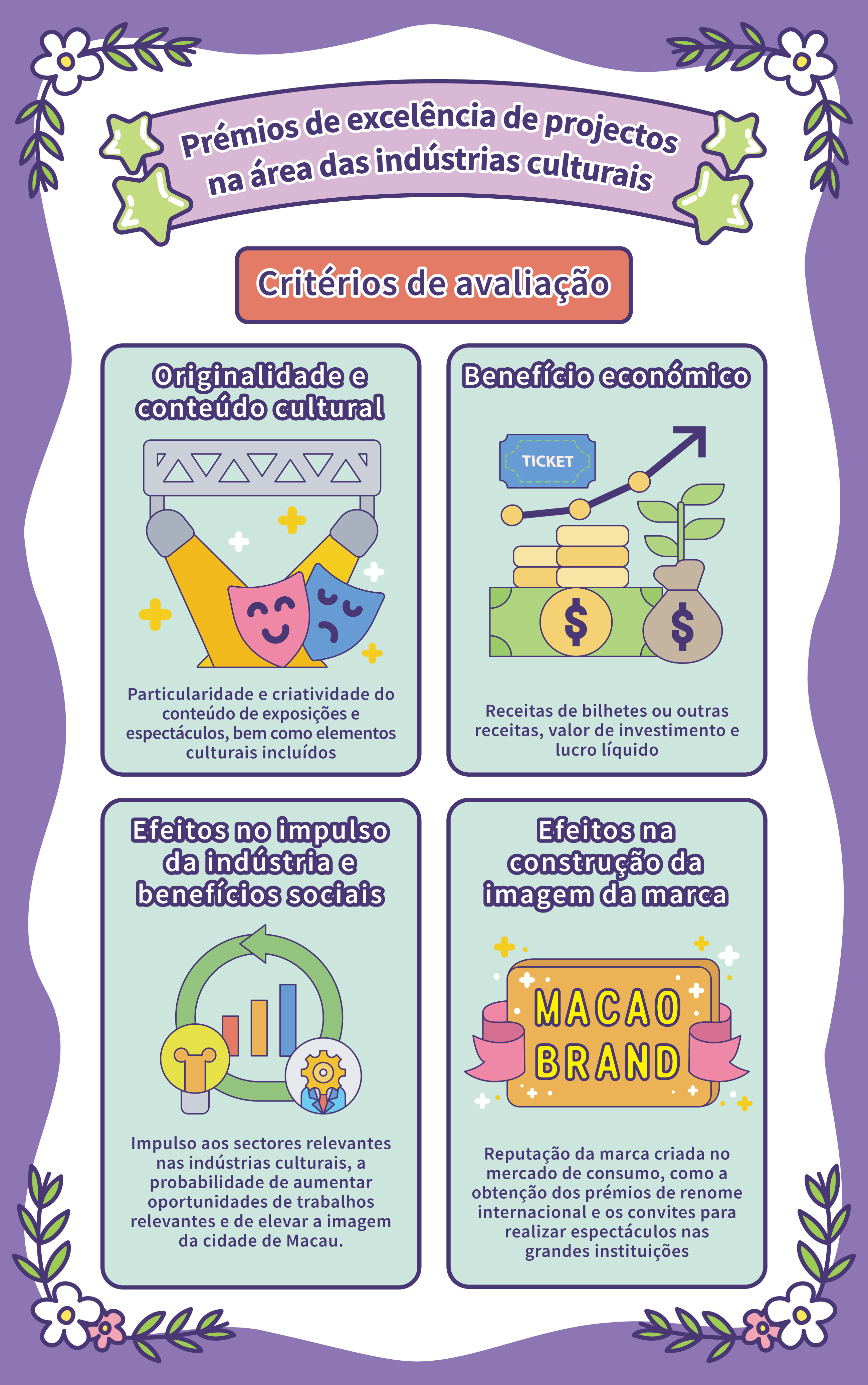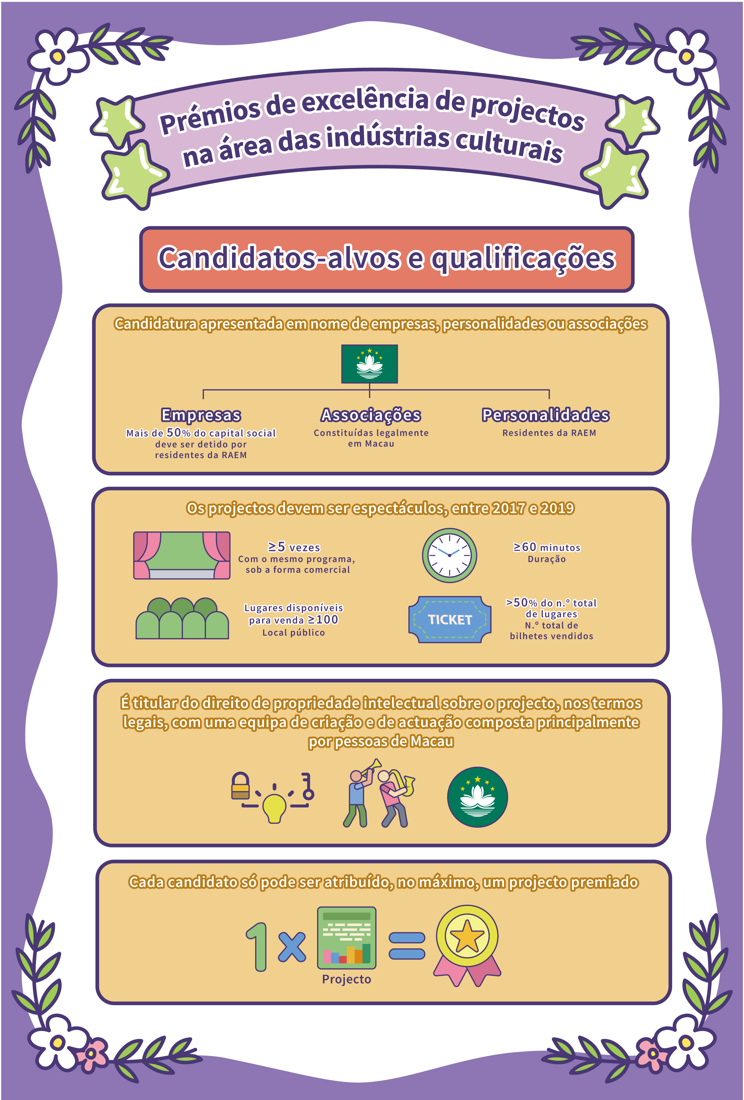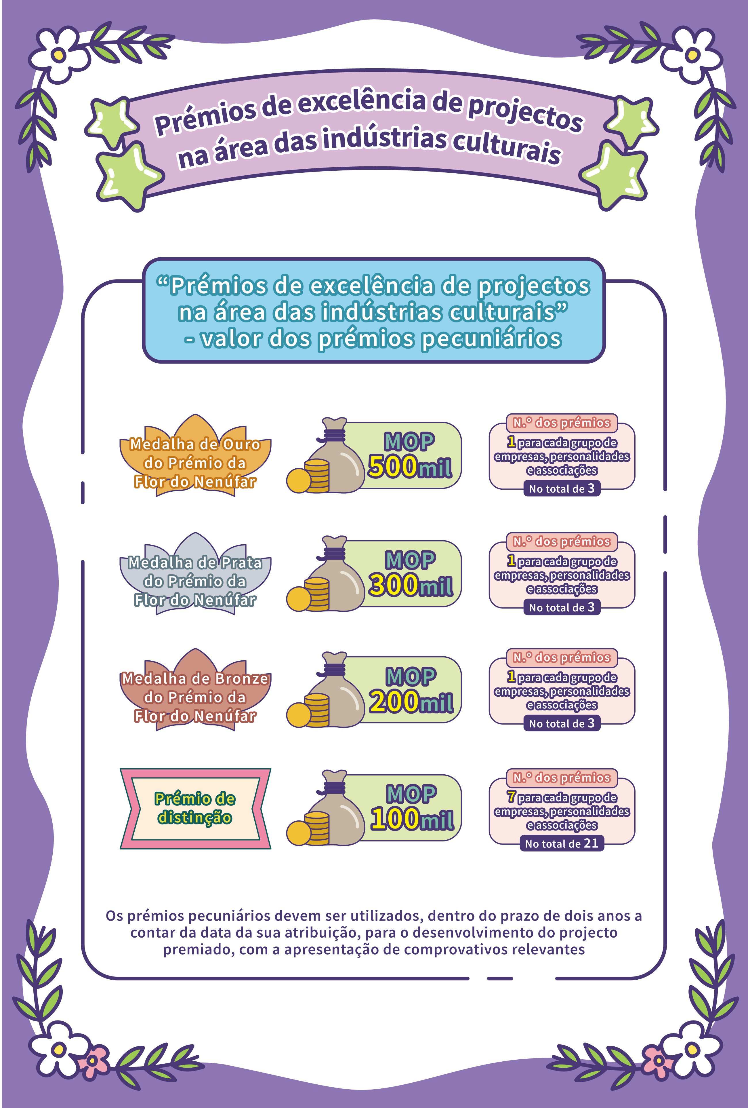 Os “Prémios de excelência de empresas” para a área de design criativo, visam premiar as empresas nesta área que tenham melhor capacidade relativa às operações financeiras e industrialização. Enquanto os “Prémios de excelência de projectos” para a área de exposições e espectáculos culturais, visam premiar os projectos desta área com maior potencialidade de desenvolvimento no mercado, conseguindo promover a marca de Macau. As empresas candidatas dos “Prémios de excelência de empresas” devem pertencer à área de design criativo e ser constituídas antes ou até 31 de Dezembro de 2016, com a operação contínua durante 2017-2019. Os candidatos-alvos dos “Prémios de excelência de projectos” da área de exposições e espectáculos culturais incluem empresas, personalidades ou associações, cujos projectos candidatos devem ser os mesmos espectáculos, realizados pelo menos 5 vezes entre os anos de 2017 e 2019, com a venda de bilhetes ao público.