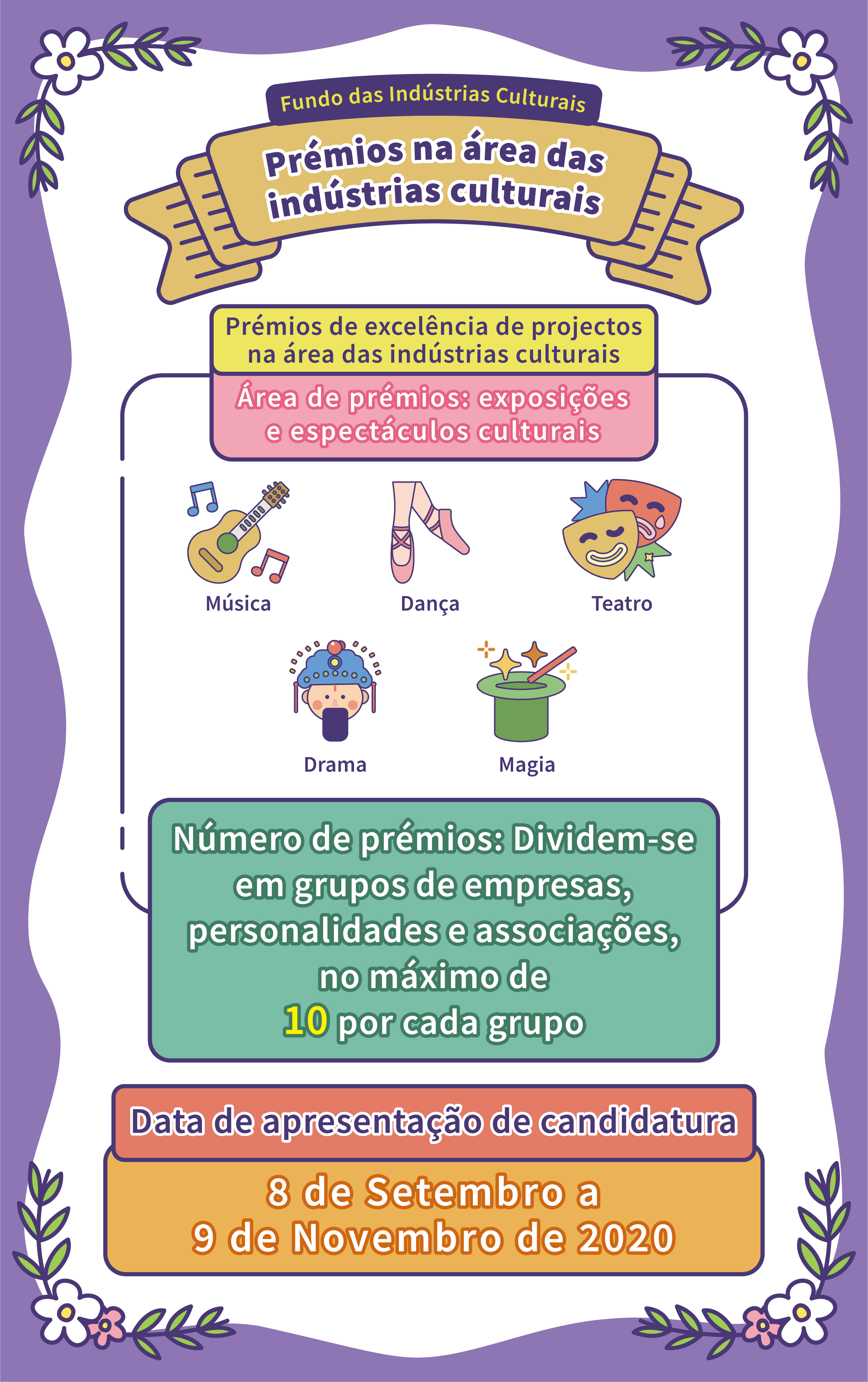 O Fundo das Indústrias Culturais (FIC) irá receber, no período de 8 de Setembro a 9 de Novembro, as candidaturas à 1.ª edição dos “Prémios na área das indústrias culturais, nomeadamente, os “Prémios de excelência de empresas na área das indústrias culturais” (adiante designados por “Prémios de excelência de empresas”), para a área de design criativo e os “Prémios de excelência de projectos na área das indústrias culturais” (adiante designados por “Prémios de excelência de projectos”), para a área de exposições e espectáculos culturais, sendo a avaliação e a selecção efectuadas pela Comissão de Avaliação das Candidaturas a Prémios. Aos premiados serão atribuídos o prémio pecuniário e o diploma de distinção, de modo a incentivar o desenvolvimento contínuo das indústrias, criando a marca de Macau.