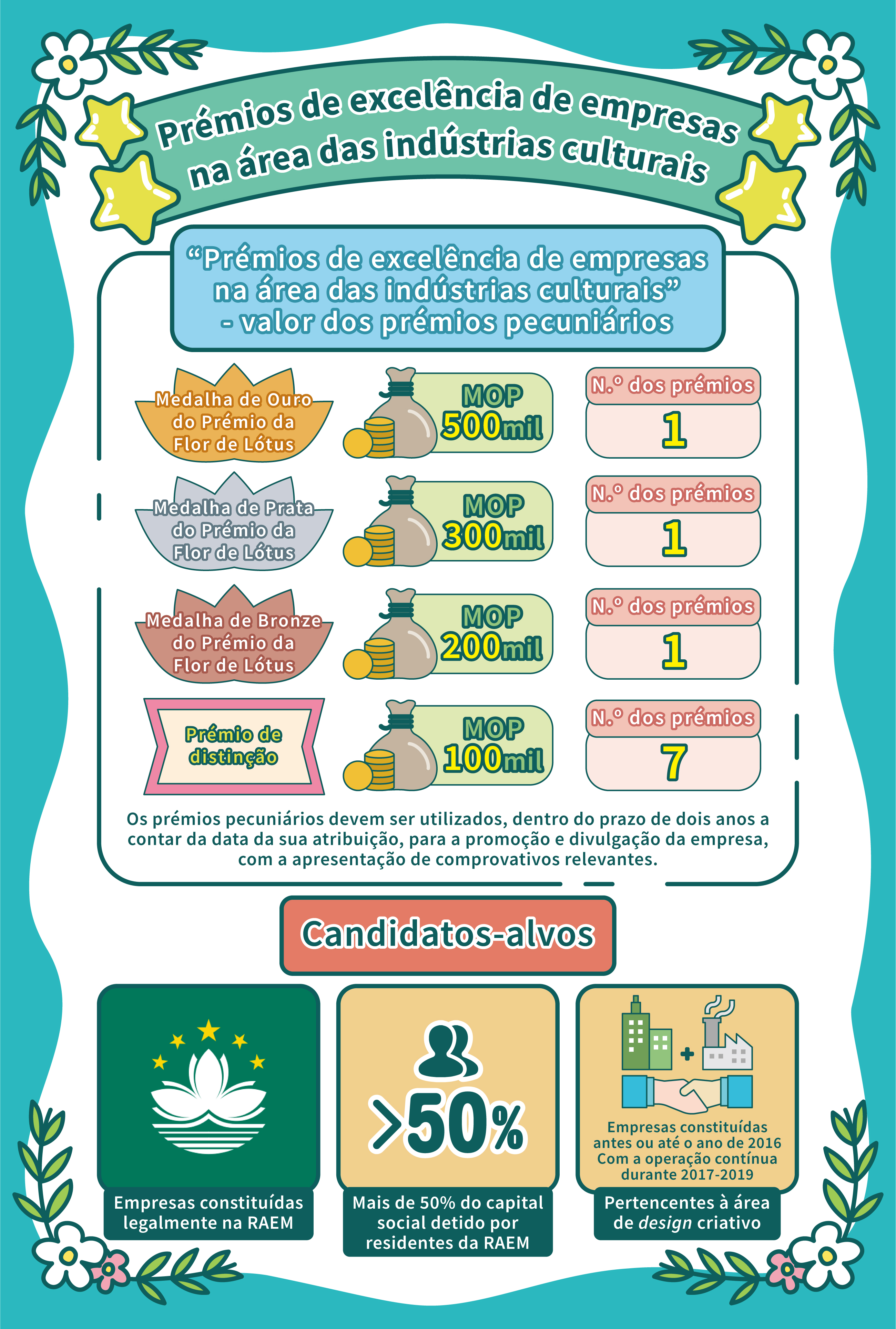 Os “Prémios de excelência de empresas” para a área de design criativo, visam premiar as empresas nesta área que tenham melhor capacidade relativa às operações financeiras e industrialização. Enquanto os “Prémios de excelência de projectos” para a área de exposições e espectáculos culturais, visam premiar os projectos desta área com maior potencialidade de desenvolvimento no mercado, conseguindo promover a marca de Macau. As empresas candidatas dos “Prémios de excelência de empresas” devem pertencer à área de design criativo e ser constituídas antes ou até 31 de Dezembro de 2016, com a operação contínua durante 2017-2019. Os candidatos-alvos dos “Prémios de excelência de projectos” da área de exposições e espectáculos culturais incluem empresas, personalidades ou associações, cujos projectos candidatos devem ser os mesmos espectáculos, realizados pelo menos 5 vezes entre os anos de 2017 e 2019, com a venda de bilhetes ao público.