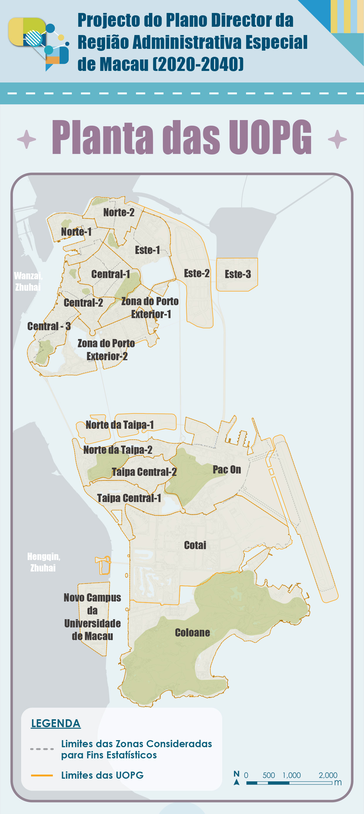 Tendo como referência as experiências e os princípios adoptados nas regiões vizinhas, serão criadas zonas administrativas delimitadas ao nível administrativo e UOPG demarcadas ao nível do planeamento urbanístico, sendo compatíveis umas com as outras. Tendo em conta as características de cada zona da RAEM (nomeadamente a densidade e estrutura demográfica, a distribuição do espaço físico e as funções de cada zona, entre outros) e as delimitações das diversas zonas estatísticas, o Projecto do Plano Director divide a sua área de intervenção em 18 UOPG, podendo cada plano de pormenor abranger mais do que uma UOPG. Os planos de pormenor estabelecerão detalhadamente as condições de uso e aproveitamento dos solos e definirão as condições de edificabilidade, nomeadamente a altura máxima permitida de edifícios, entre outros.