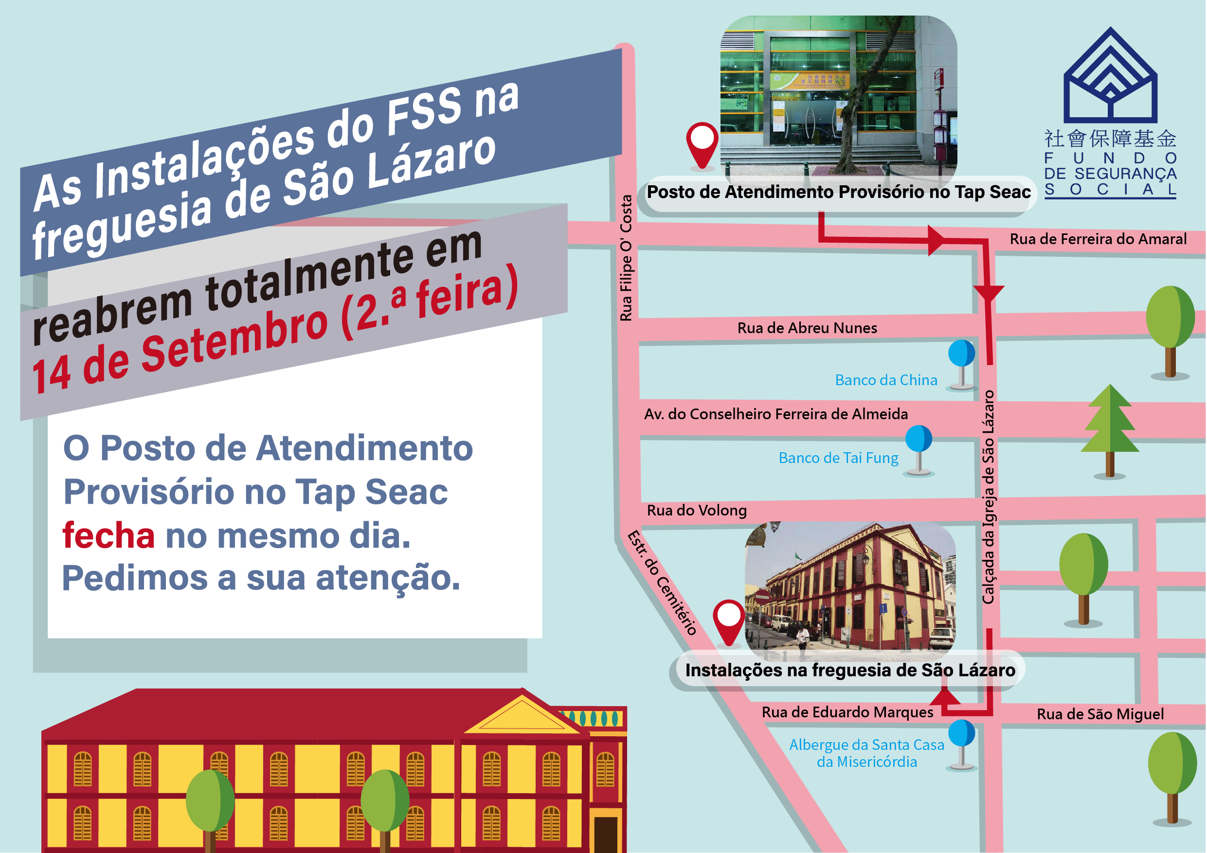 Com a reabertura das Instalações do FSS na freguesia de São Lázaro (Endereço: Rua de Eduardo Marques, n.os 2-6, Macau), o Posto de Atendimento Provisório no Tap Seac foi fechado. Os cidadãos que pretendam dirigir-se aos balcões do FSS para tratar dos serviços do FSS, podem deslocar-se às Instalações do FSS na freguesia de São Lázaro ou ao Centro de Serviços da RAEM na Areia Preta (Assuntos de Segurança Social) ou ao Centro de Serviços da RAEM das Ilhas (Assuntos de Segurança Social), ou às Instalações do FSS no NAPE, Edf. China Civil Plaza, 13.º andar (Presta-se apenas serviços relativos a contribuições).