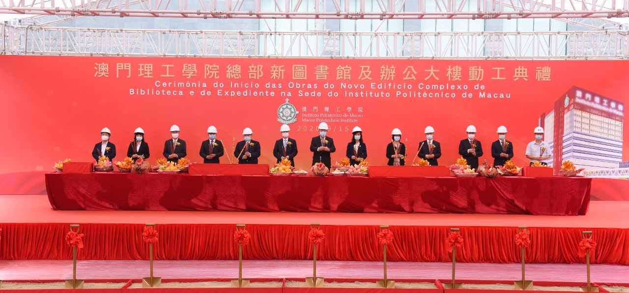 A Cerimónia do Início das Obras do Novo Edifício Complexo de Biblioteca e de Expediente na Sede do IPM teve início às 15:00 horas do dia 15 de Setembro, tendo sido presidida pelo Chefe do Executivo, Doutor Ho Iat Seng, contando também com a participação do Subdirector do Gabinete de Ligação do Governo Central na RAEM, Dr. Zhang Rongshun, da Secretária para os Assuntos Sociais e Cultura, Eng.ª Ao Ieong U, do Vice-Presidente da Assembleia Legislativa, Doutor Chui Sai Cheong, da Directora dos Serviços de Solos, Obras Públicas e Transportes, Eng.ª Chan Pou Ha, do Director, substituto, dos Serviços do Ensino Superior, Dr. Chang Kun Hong, do Presidente do Conselho Geral do IPM, Prof. Doutor Lei Heong Iok e do seu Vice-Presidente Dr. Lok Po, do Presidente do IPM, Prof. Doutor Im Sio Kei, do Presidente da Associação de Estudantes do IPM, Sr. Ng Ka Kei, do Presidente da Associação dos Antigos Alunos do IPM, Sr. Wong U Kei, do Administrador e Gerente-Geral da Companhia de Construção e Obras de Engenharia Tong Lei, Limitada, Sr. Tang Weng Un e do Administrador e Gerente-Geral da Companhia Top Builders International Co. Ltd., Sr. Tang Hon Cheong, e ainda com uma participação de cerca de cem outros convidados, incluindo os membros do Conselho Geral do IPM, personalidades de vários sectores da sociedade, professores, alunos, pessoal administrativo e antigos estudantes do IPM, testemunhando, em conjunto, o arranque deste novo marco do desenvolvimento do IPM.