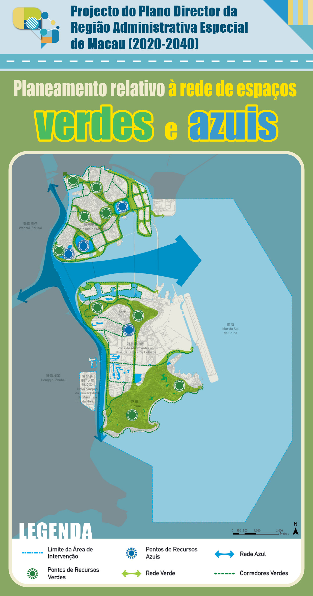 No intuito de conseguir obter um equilíbrio entre a construção urbana e a protecção ambiental, o projecto pretende delimitar as zonas de conservação ecológica, as zonas verdes ou de espaços públicos abertos (que totalizam 26% da área global da RAEM), proteger os recursos naturais de valor ecológico (nomeadamente as principais colinas, os meios aquáticos e as terras húmidas) e construir uma estrutura assente na relação “montanha, mar e cidade”. Através da ligação dos diversos recursos naturais (zonas verdes e zonas aquáticas), criar-se-á uma rede de espaços verdes e espaços azuis e implementar-se-á uma interligação visual e paisagística entre os espaços verdes, com vista a melhorar o ambiente urbano e a qualidade da vida dos cidadãos e constituir a RAEM como uma cidade verde adequada para viver.