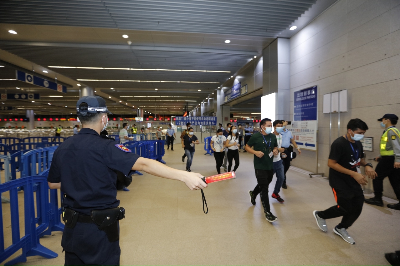 Durante o exercício, foi simulado a aparência de um caso de incêndio nos Serviços de Partidas junto do átrio de partidas do Edifício do Posto Fronteiriço das Portas do Cerco, enquanto um turista se encontrava a pagar a multa, a sua mala libertou fumo que pouco tempo depois, surgiu chamas, e em seguida a mala ficou rapidamente incendiada, o qual causou dois feridos. Os guardas no local tentaram extinguir o incêndio com o extintor, mas como a propagação do incêndio acelerou rapidamente, os guardas do piquete do Edifício do Posto Fronteiriço das Portas do Cerco ligaram logo ao CB e, ao mesmo tempo, de acordo com o mecanismo de comunicação, emitiram o comunicado aos outros serviços para prestarem apoio. A entidade policial adoptou as medidas de segurança de acordo com o plano de emergência estabelecido, evacuando as pessoas e os turistas do local para o ponto de encontro de evacuação.