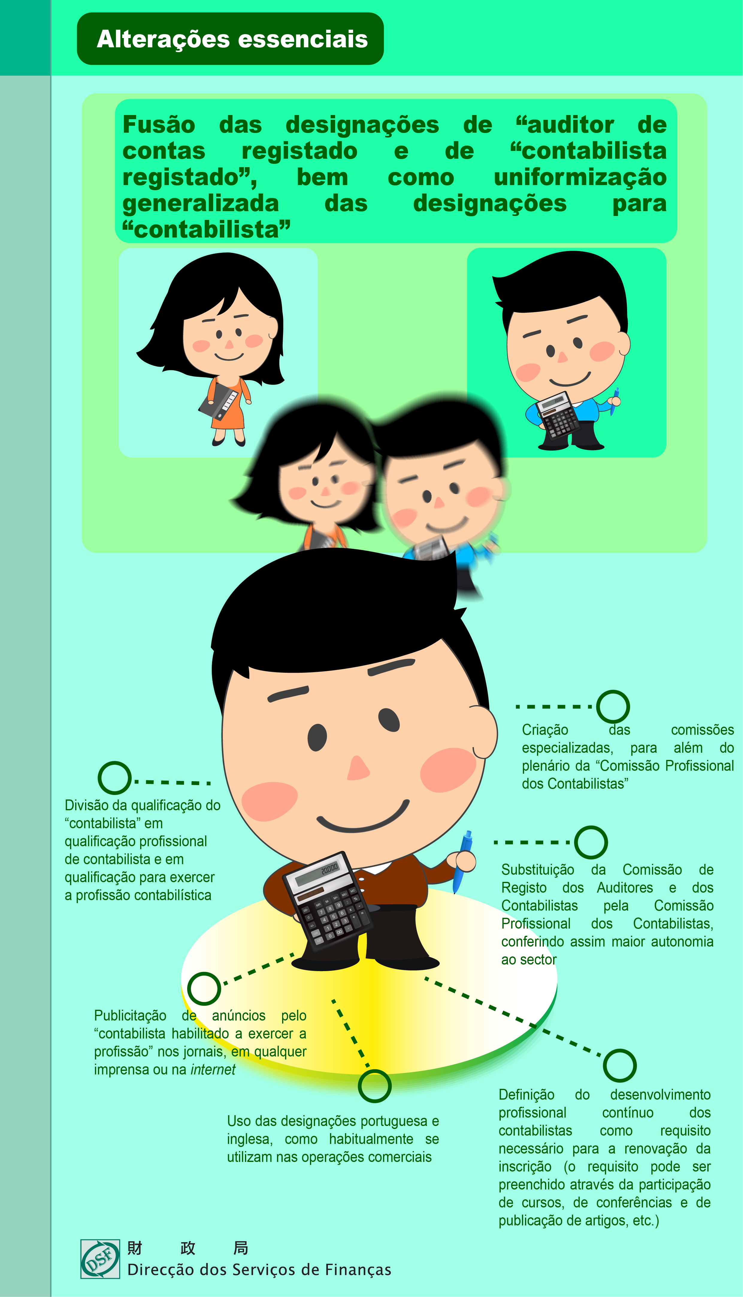 1) As designações de “auditor de contas registado e de “contabilista registado” vão ser fundidas e uniformizadas, com uma designação genérica de “contabilista”. A fusão pode resolver, de forma eficaz, as situações díspares entre o título adoptado na profissão contabilística de Macau e o uso generalizado da designação internacional, que existem desde há muito tempo, favorecendo, deste modo, a articulação com o enquadramento internacional;