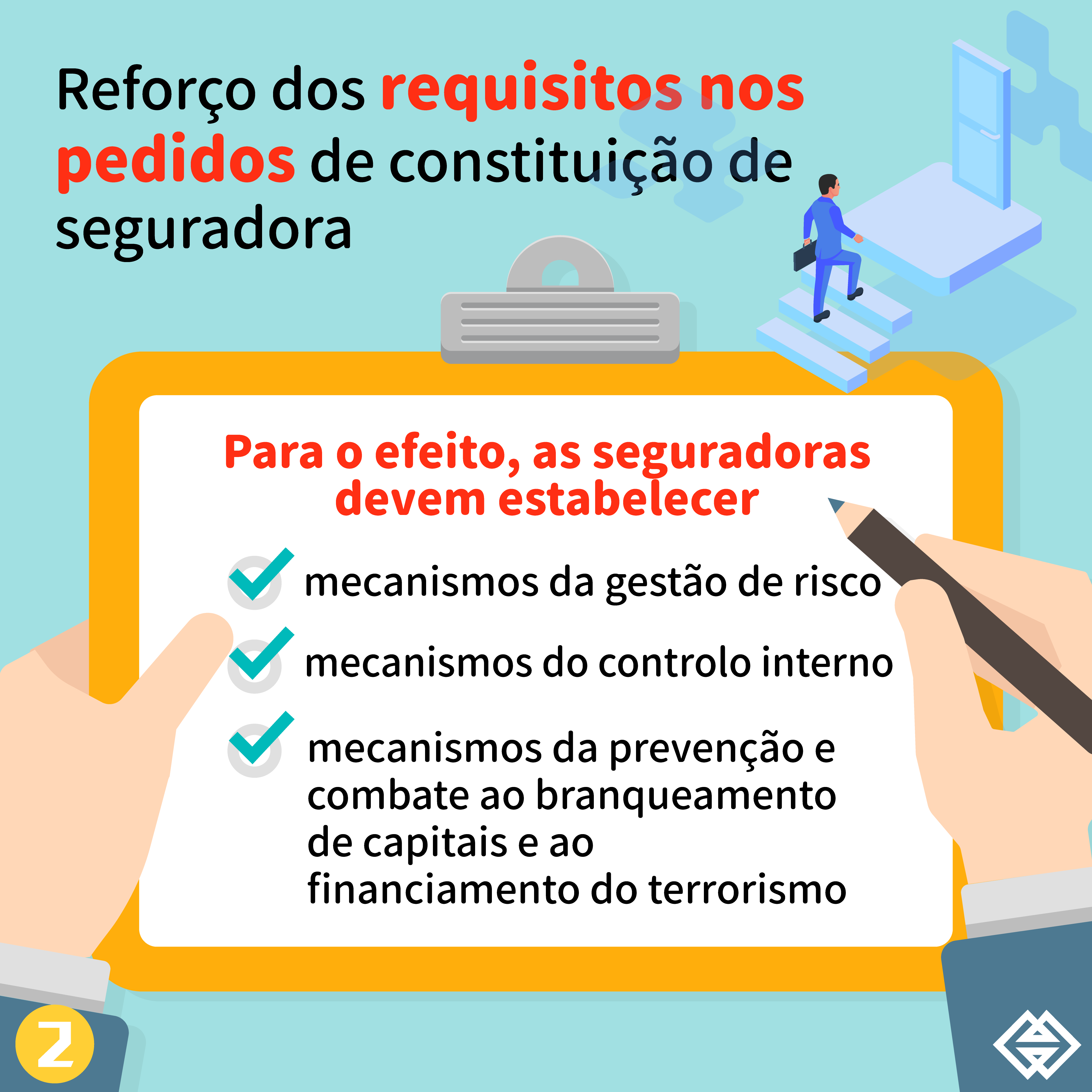 1.o Aumento dos requisitos nos pedidos de constituição de seguradora e extensão do âmbito de apreciação da idoneidade dos requerentes, reforço dos requisitos de mecanismos de gestão de risco, do controlo interno e da prevenção e combate ao branqueamento de capitais e ao financiamento do terrorismo do sector segurador, assegurando que as seguradoras possuem uma política aperfeiçoada de gestão da sociedade;