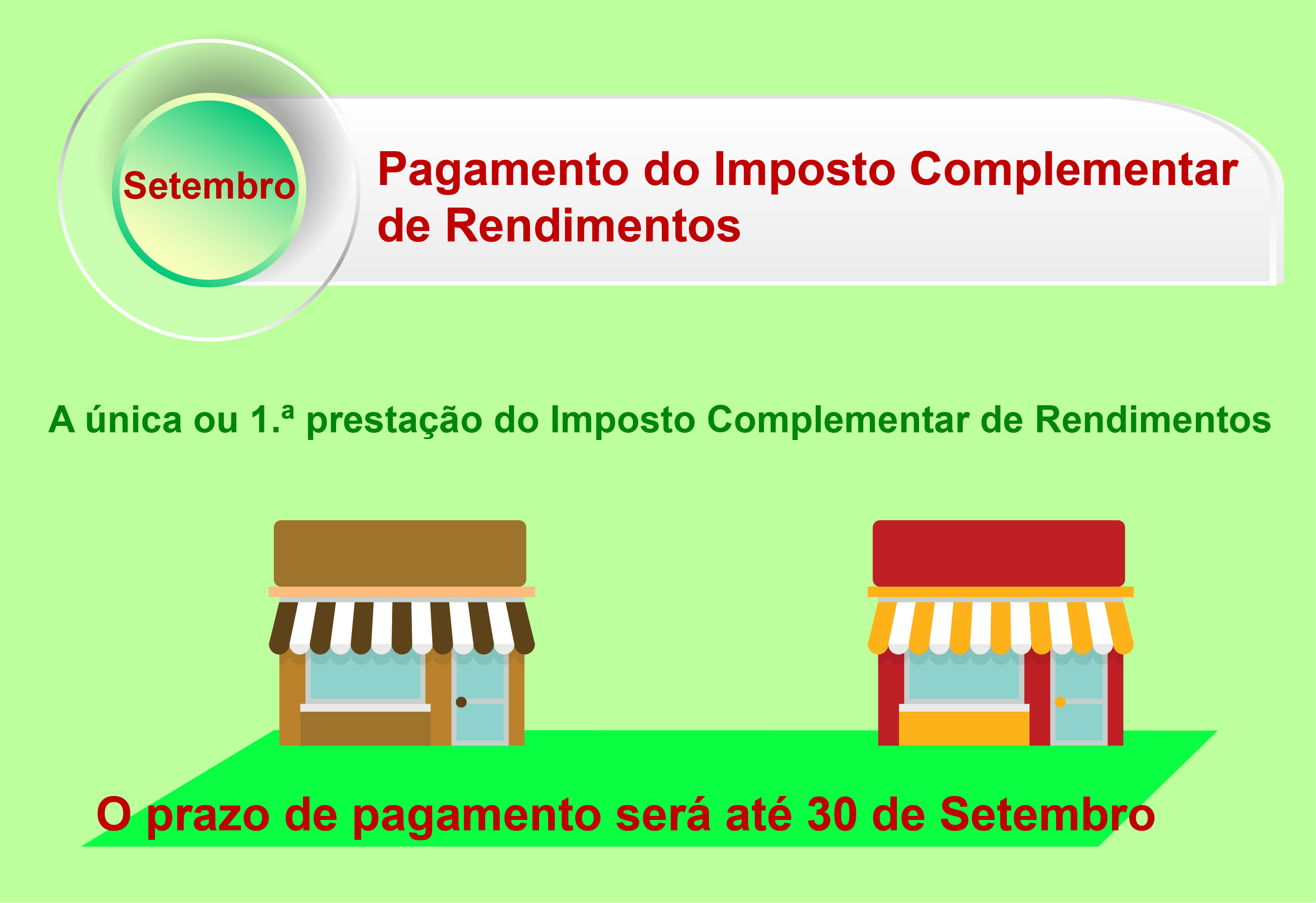 A Direcção dos Serviços de Finanças vem lembrar os contribuintes que o prazo de pagamento da única ou 1.ª prestação do Imposto Complementar de Rendimentos termina no próximo dia 30 de Setembro. O não pagamento da 1.ª prestação no mês de vencimento (Setembro) importa para além da cobrança de juros de mora e 3% de dívidas, o imediato vencimento da prestação vincenda. Para evitar perdas de tempo de espera ou o pagamento adicional de juros de mora e multa devido ao pagamento fora do prazo, esta Direcção de Serviços apela aos contribuintes que ainda não o fizeram para efectuarem o respectivo pagamento com a maior brevidade possível, por meio das formas de pagamento disponibilizadas pelos Serviços de Finanças, podendo ainda fazê-lo dentro das horas de expediente, nos balcões dos Bancos indicados ou por sua transacção electrónica ou nas Recebedorias instaladas, respectivamente, no Edifício “Finanças” sito na Avenida da Praia Grande, no Edifício “Long Cheng”, no Centro de Serviços da RAEM e no Centro de Serviços da RAEM das Ilhas.