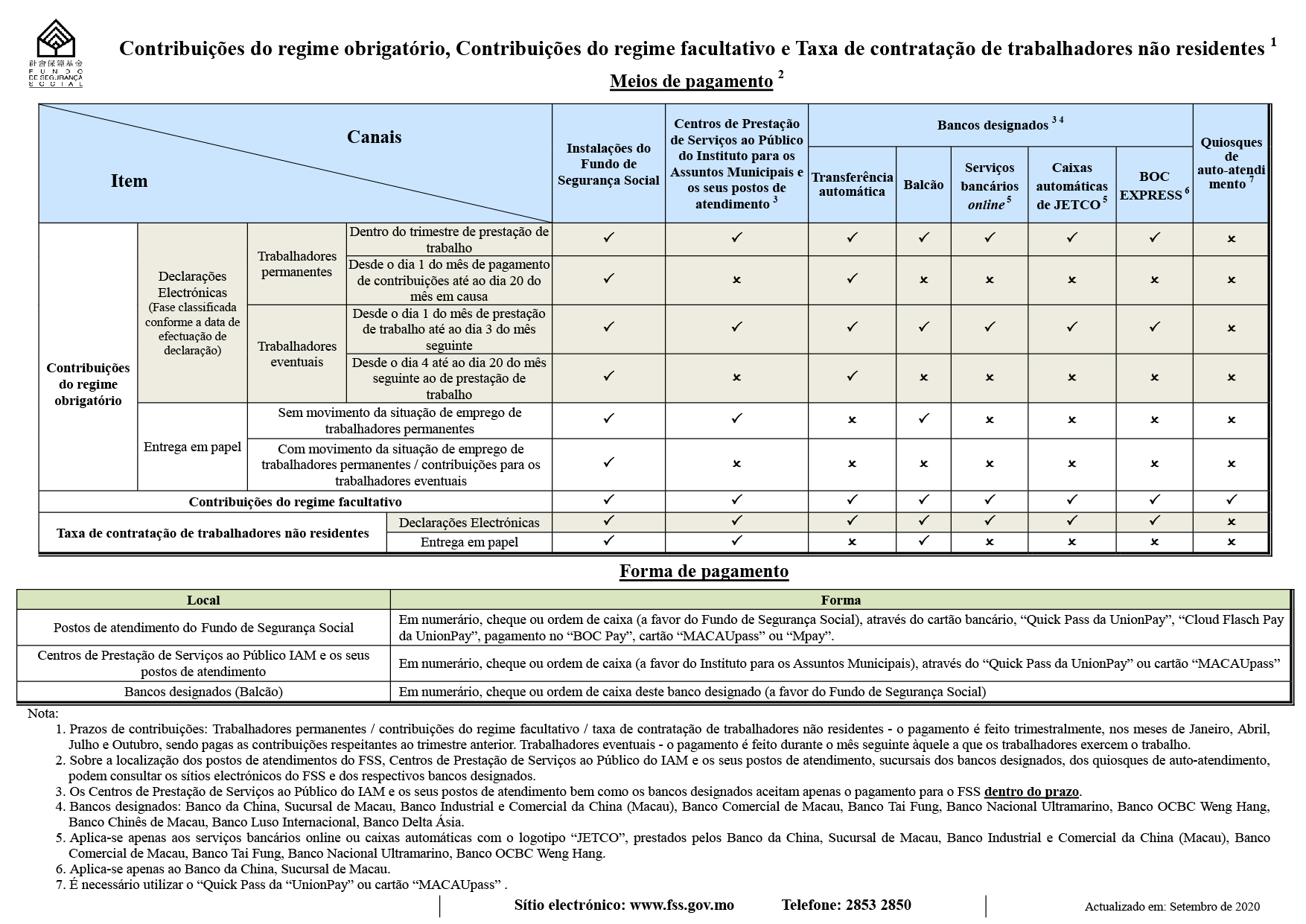 No que diz respeito às contribuições do regime obrigatório, sugerimos aos empregadores que estão a utilizar o serviço de declarações electrónicas para usarem mais a transferência automática ou os meios acima referidos para pagamento de verbas (excepto quiosques de auto-atendimento). Quanto aos empregadores que ainda não utilizam o serviço de declarações electrónicas, o pagamento de contribuições ou de taxa de contratação de trabalhadores não residentes pode ser feito nos postos de atendimento do FSS. Caso não haja movimento de trabalhadores permanentes no trimestre em curso, o pagamento das verbas referidas pode ainda ser feito nos Centros de Prestação de Serviços ao Público do IAM e nos respectivos postos ou nos balcões dos bancos designados.