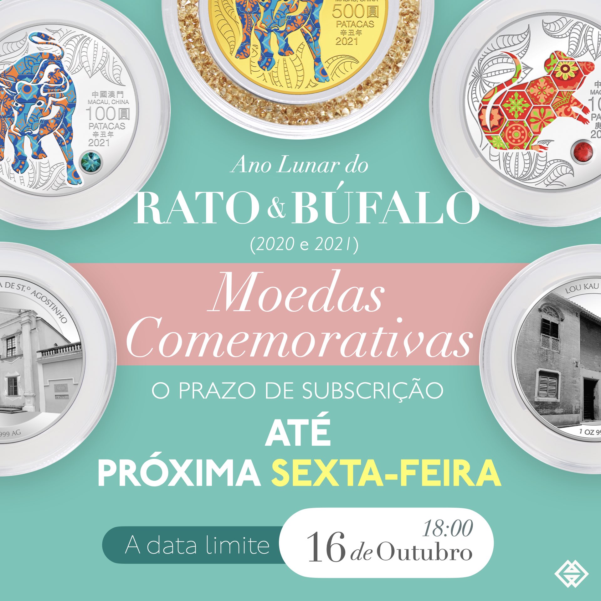A subscrição “online” da nova série de moedas comemorativas do Ano Lunar do Rato e do Ano Lunar do Búfalo iniciou-se na última segunda-feira (dia 28 de Setembro) e termina às 18 horas da próxima sexta-feira (dia 16 de Outubro). Assim, a AMCM gostaria de alertar os residentes interessados em subscrever estas moedas, para a necessidade de concluírem o processo de subscrição “online”, o mais rapidamente possível, antes do referido prazo. A AMCM instalou um balcão no seu “lobby”, ao serviço dos cidadãos idosos que necessitem de assistência.