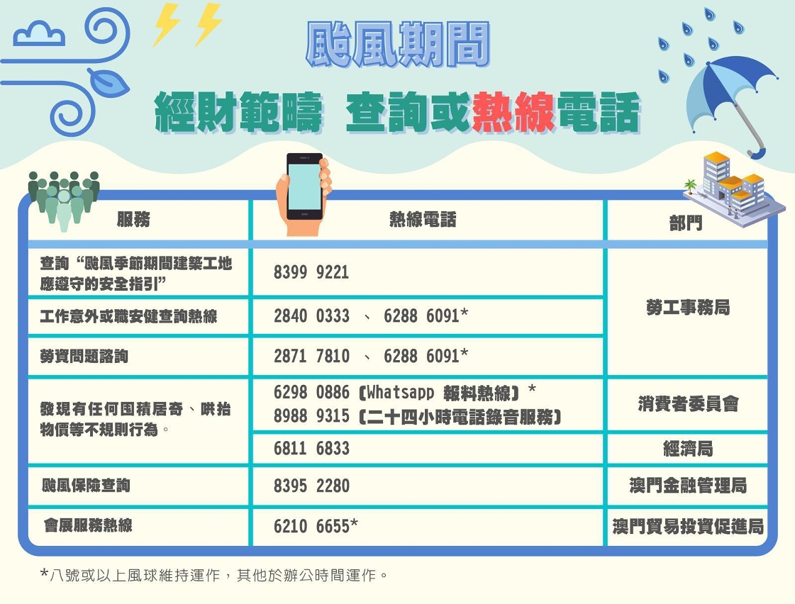 A Direcção dos Serviços para os Assuntos Laborais (DSAL) alerta às empresas que, quando for necessária a prestação do trabalho por parte dos trabalhadores durante o sinal n.º 8 ou superior de tufão, para além de adquirir a respectiva apólice de seguro laboral a favor desses trabalhadores, devem também proceder à organização da vinda e saída dos trabalhadores e às medidas no trabalho, ou seja, se a empresa possuir condições, deve ponderar a disponibilização de transporte para ida e volta dos trabalhadores, e proporcionar período e local de descanso adequados, para garantir a segurança dos mesmos, devendo ainda, ser compreensiva em relação ao trabalho árduo dos seus trabalhadores, atingindo uma compreensão mútua entre as partes. Para prestar apoio aos cidadãos no tratamento de assuntos urgentes sobre problemas laborais ou acidentes de trabalho, foi criada especialmente a linha de emergência 62886091, permitindo que os cidadãos contactem os trabalhadores da DSAL, para que lhes seja prestado, oportunamente, o devido apoio.