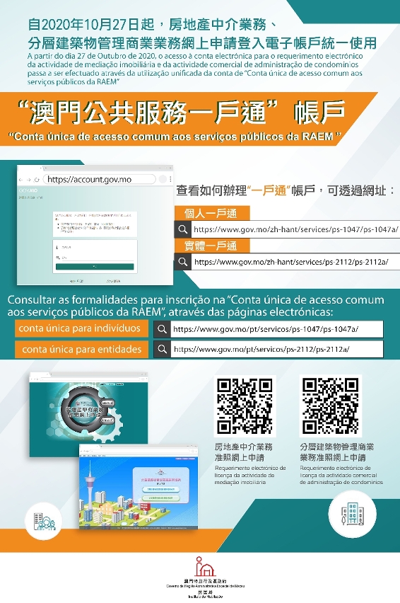 No sentido de concretizar a “Governação electrónica”, a partir do dia 27 de Outubro de 2020, o acesso à conta electrónica para os requerimentos electrónicos da actividade de mediação imobiliária e da actividade comercial de administração de condomínios passa a ser efectuado através da utilização unificada da “Conta única de acesso comum aos serviços públicos da RAEM” (“Conta única de acesso comum”), passando a ser emitidas licenças digitais.