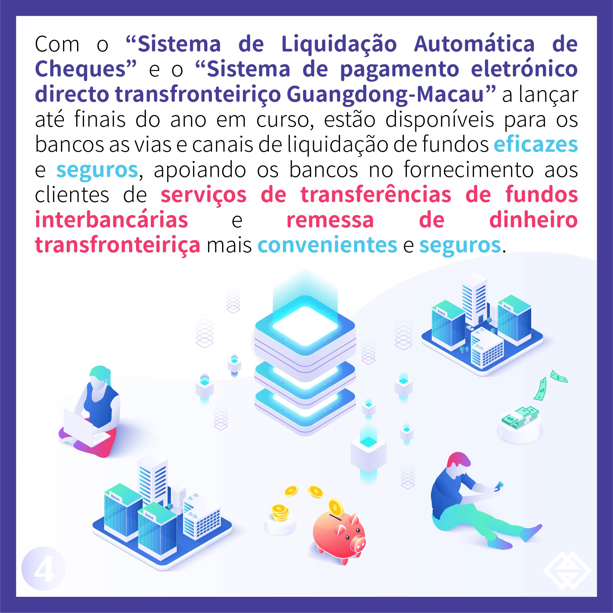Com vista a promover a facilitação das operações de transferência de fundos e, na sequência dos projectos denominados “Sistema de Liquidação Imediata em tempo real em Patacas (MOP RTGS)” e “Sistema de Liquidação Imediata em tempo real em RMB (RMB RTGS)”, estabelecidos nos últimos anos, a que acresce o projecto “HKD RTGS”, que entrou, recentemente, em funcionamento, o Governo da RAEM ultimou a implementação dos três sistemas RTGS nas três moedas mais utilizadas em Macau. Neste contexto, com o “Sistema de Liquidação Automática de Cheques” e o “Sistema de pagamento eletrónico directo transfronteiriço Guangdong-Macau” a lançar até finais do ano em curso, estão disponíveis para os bancos as vias e canais de liquidação de fundos eficazes e seguros, apoiando os bancos no fornecimento aos clientes de serviços de transferências de fundos interbancárias e remessa de dinheiro transfronteiriça mais convenientes e seguros.