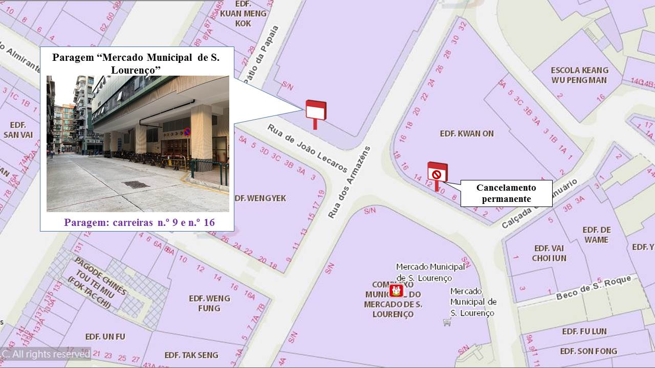 Consequentemente, a paragem “Mercado Municipal de S. Lourenço” deslocar-se-á de forma permanente para cerca de 20 metros em direcção à Rua do Almirante Sérgio, isto é, para a zona de tomada e largada de passageiros e mercadorias do Complexo Municipal de Serviços Comunitários da Rua da Praia do Manduco situado na Rua de João Lecaros, continuado a permitir a paragem das carreiras n.º 9 e n.º 16.