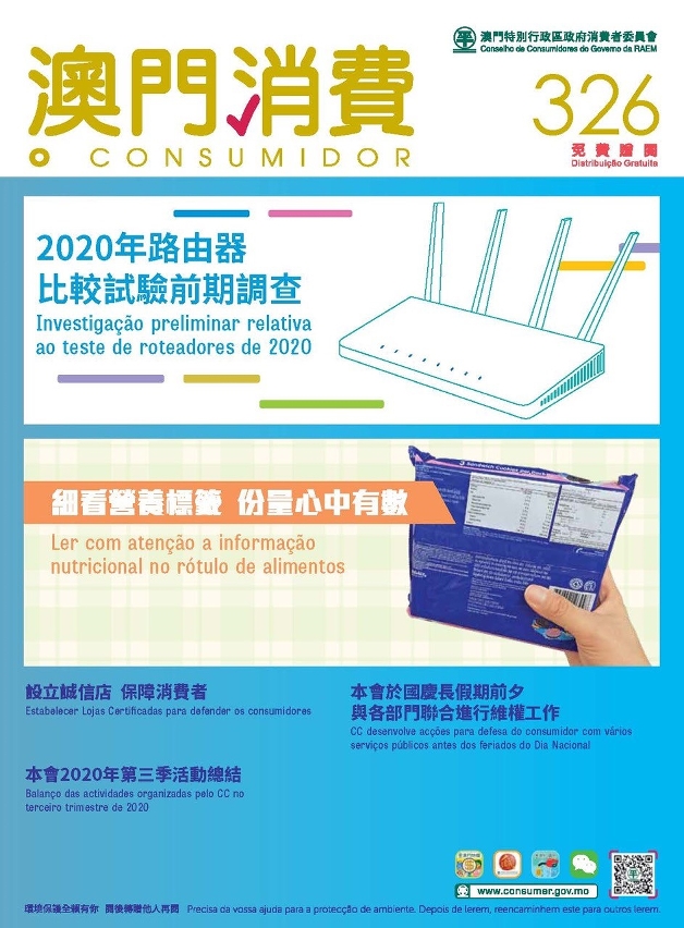 Os consumidores agora podem visualisar a revista “O Consumidor” n.º 326 na página electrónica do CC (www.consumer.gov.mo) e na sua conta de WeChat, bem como obter a revista em suporte de papel na sede do CC, sita no Edifício Clementina Ho, Av. Horta e Costa n.º 26, no posto de atendimento ao público do CC situado na Rua Nova da Areia Preta, Centro de Serviços da RAEM, 1.º andar, Zona M, no Centro de Informações ao Público situado na Rua do Campo, Vicky Plaza, nas bibliotecas que funcionam sob a tutela do Instituto Cultural, na Sala de Leitura da Associação Comercial de Macau ("Biblioteca Octogonal") e na Plaza Cultural Macau.