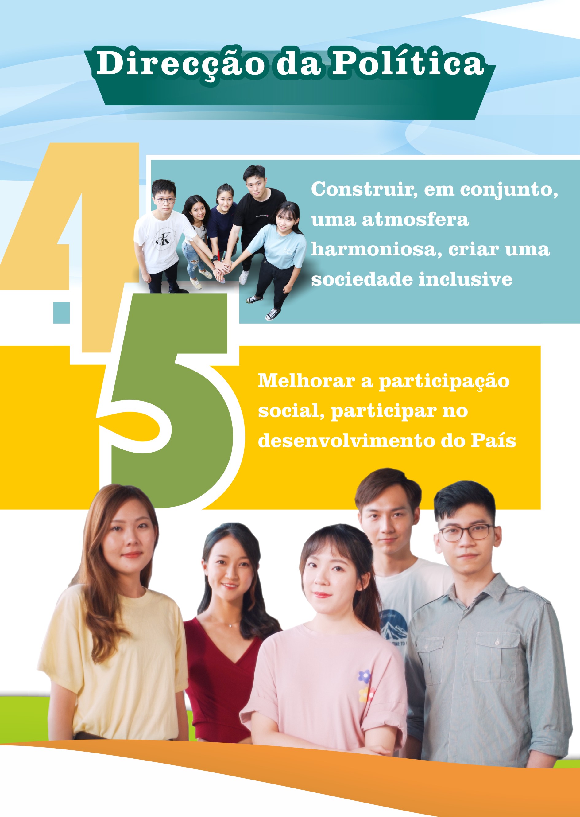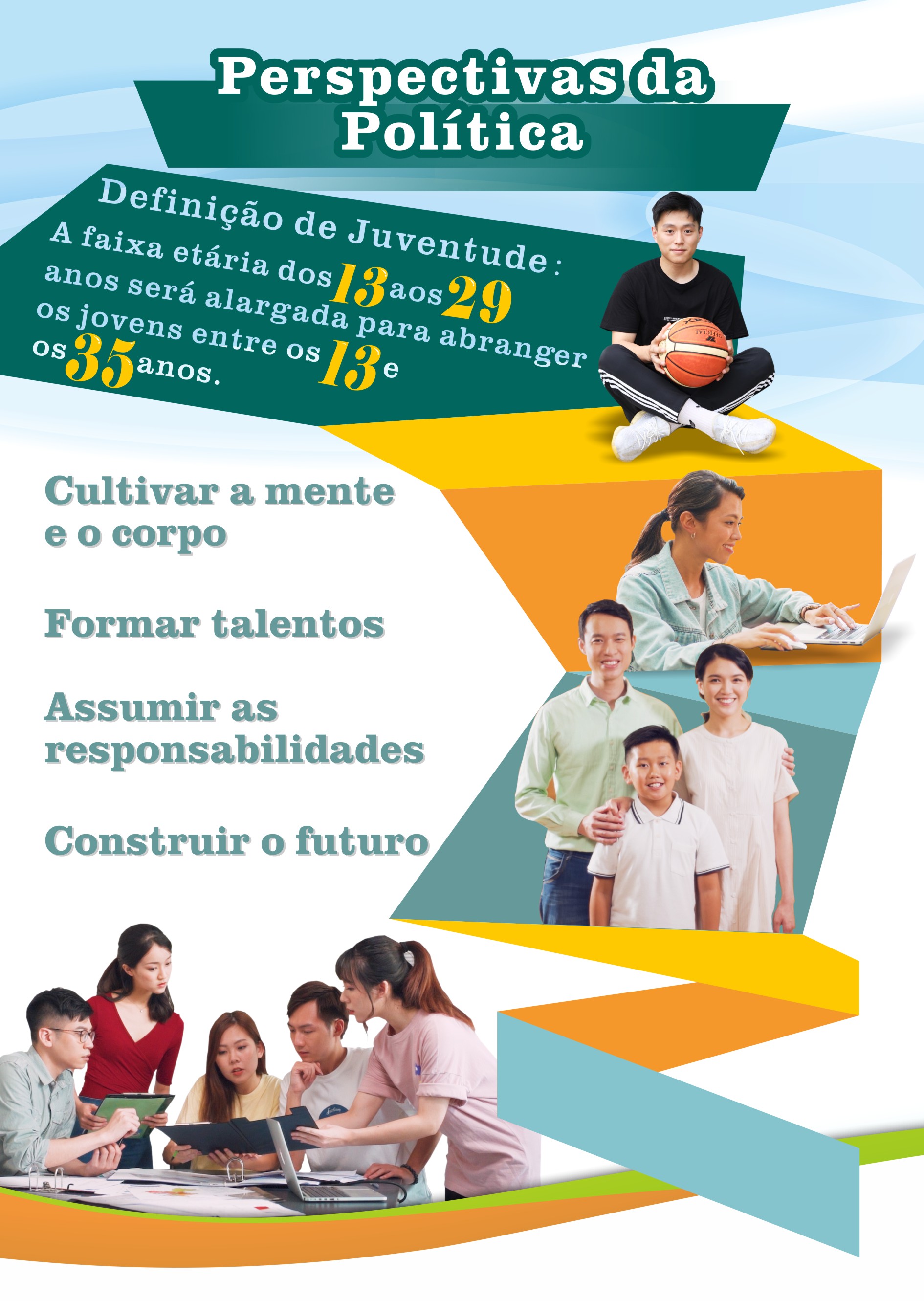 A nova Política de Juventude tem o prazo de 10 anos e passará a abranger jovens com idades entre os 13 e os 35 anos, quando antes abrangia as idades entre os 13 e os 29 anos, com vista a articular-se com as Políticas de Juventude do País e das diversas cidades da Grande Baía Guangdong-Hong Kong-Macau. A nova Política de Juventude tem como perspectivas a “formação de boas condições físicas e psicológicas, desenvolvimento de valores morais dignos e talento, manifestação da coragem de assumir as responsabilidades e construção do futuro”. Com os esforços envidados pelo Governo e os diversos sectores da sociedade, a actual Política de Juventude conseguiu criar um bom ambiente para o crescimento dos jovens. No futuro, para além de continuar a acompanhar a formação de valores morais dignos, a saúde física e psicológica e as capacidades integrais dos jovens, a Política de Juventude dará ainda maior importância à formação para a conscientização dos tempos e da assunção das responsabilidades nos jovens. A Política de Juventude enquadra 5 grandes direcções, nomeadamente, “Herdar o amor à Pátria e a Macau, reforçar o sentimento patriótico”, “Exercitar a virtude, aprimorar a qualidade física e mental”, “Aumentar as capacidades integradas, promover o desenvolvimento integral”, “Construir, em conjunto, uma atmosfera harmoniosa, criar uma sociedade inclusiva” e “Melhorar a participação social, participar no desenvolvimento do País” e, ainda, 10 medidas fundamentais, designadamente, “Reforçar a educação do amor pela Pátria e aumentar o sentimento patriótico”, “Fortalecer a educação moral e promover uma vida saudável”, “Melhorar as qualidades globais e reforçar as competências essenciais” “Reforçar o cultivo de talentos e promover o desenvolvimento diversificado”, “Intensificar o intercâmbio com o exterior e expandir o espaço para o desenvolvimento”, “Reforçar o intercâmbio e criar um ambiente positivo”, “Promover a inclusão social e garantir a igualdade de oportunidades”, “Apoiar o associativismo juvenil e realçar a força das associações”, “Cultivar a consciência para a participação na sociedade e o interesse pelo desenvolvimento social” e “Garantir o investimento em recursos e integrar diferentes tipos de recursos”. Promove, igualmente, o desenvolvimento integral dos jovens, ajuda-os a incluírem-se na cooperação inter-regional e no desenvolvimento nacional, a par de reforçar as suas experiências e a consciência para a assunção das responsabilidades, com vista a permitir que desenvolvam as suas potencialidades e contribuam para a sociedade.