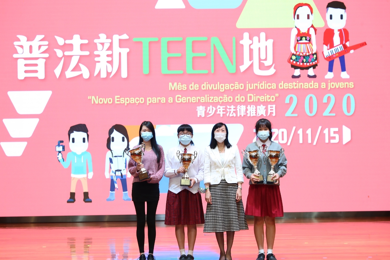 De modo a procederem à continuação da promoção dos trabalhos de divulgação das leis e ao balanço dos resultados das actividades, os serviços, acima mencionados, realizaram, no dia 15 de Novembro, no auditório da Escola da Associação Geral das Mulheres de Macau, a sessão de encerramento e cerimónia de entrega dos prémios do mês da divulgação jurídica destinada a jovens, no âmbito da actividade “Novo Espaço para a Generalização do Direito”, com a participação dos seguintes convidados: Adjunta do Comandante-geral dos Serviços de Polícia Unitários, Lao Wan Seong, Subdirector da DSEJ, Kong Chi Meng, Subdirectora da DSAJ, Leong Pou Ieng, Vice-presidente do IC, Leong Wai Man, Chefe do Departamento de Juventude da DSEJ, Cheong Man Fai, Chefe do Departamento de Prevenção e Tratamento da Dependência do Jogo e da Droga do IAS, Cheang Io Tat, Chefe da Divisão de Ligação entre Polícia e Comunidade e Relações Públicas da PJ, Cheang Pou Seong, Subintendente da Divisão de Relações Públicas do CPSP, Lei Tak Fai, Chefe da Divisão de Educação Cívica do Instituto para os Assuntos Municipais, Lam Mei Sio, Chefe da Divisão de Apoio aos Estudantes das Instituições do Ensino Superior da Direcção dos Serviços do Ensino Superior, Vong Iut Peng, Chefe Substituta da Divisão de Licenciamento e de Apoio Técnico da DSAL, Lam Pui Heng, Chefe Substituta da Divisão de Relações Públicas da DSAJ, Wong Ka Wai, Chefe Assistente do Departamento de Estudo e Planeamento do Corpo de Bombeiros, Lei Chi Hou, vogais do Conselho de Juventude e ainda representantes de escolas e instituições participantes.