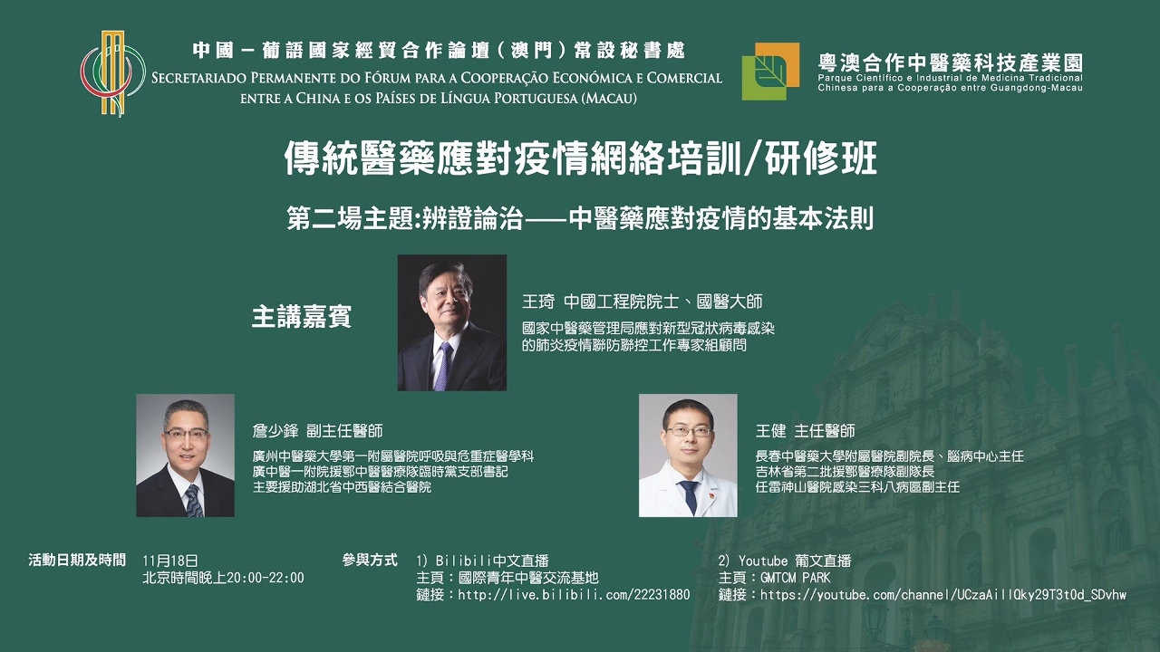 O Curso de Formação Online sobre o Uso de Medicina Tradicional no Combate à Pandemia de COVID-19 foi organizado pelo Secretariado Permanente do Fórum de Macau e pelo Parque Científico e Industrial de Medicina Tradicional Chinesa para a Cooperação entre Guangdong-Macau. A 2.ª Sessão do Curso realizou-se online em 18 de Novembro de 2020, pelas 20H00 (hora de Pequim), com o tema de “Diferenciação de síndrome e tratamento - Princípios básicos do uso da medicina chinesa em resposta à epidemia”, discutindo os assuntos de experiências da aplicação clínica da medicina tradicional chinesa no tratamento de COVID-19, a situação sobre o uso da medicina tradicional chinesa nos trabalhos de prevenção e no tratamento de COVID-19 e da troca de experiências do tratamento clínico de casos graves de Covid-19.