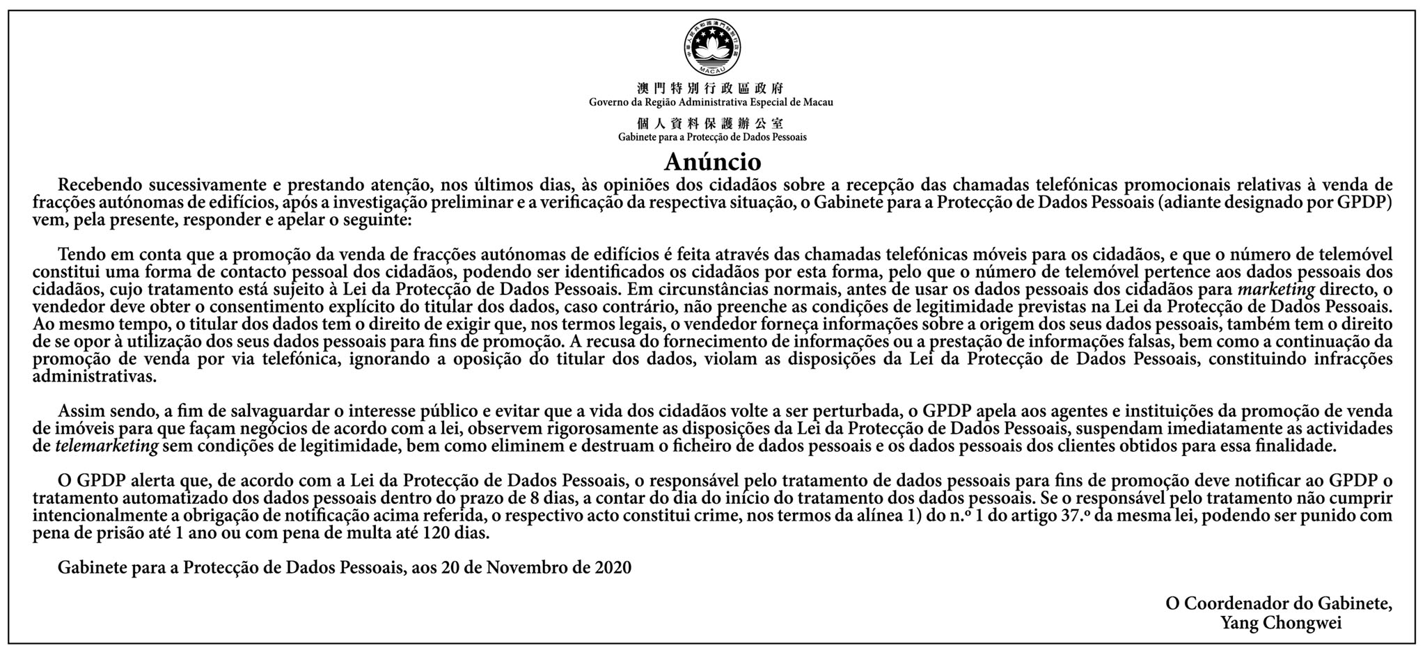 O Gabinete para a Protecção de Dados Pessoais (adiante designado por GPDP) continua a executar rigorosamente a lei contra as actividades ilegais de telemarketing que perturbam a vida quotidiana dos cidadãos, e já produziu os seus primeiros resultados. De acordo com as estatísticas preliminares, nos primeiros 11 meses do corrente ano, o valor total das multas será superior a 12 milhões de patacas, e alguns casos encontram-se ainda em fase de investigação, não se excluindo a possibilidade de ser posteriormente aplicados de sanções.
