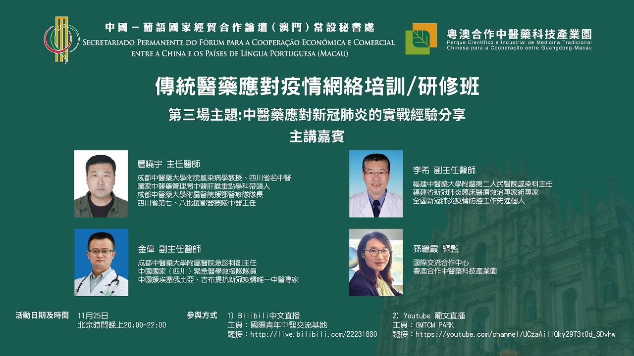 O Curso de Formação Online sobre o Uso de Medicina Tradicional no Combate à Pandemia de COVID-19 foi organizado pelo Secretariado Permanente do Fórum de Macau e pelo Parque Científico e Industrial de Medicina Tradicional Chinesa para a Cooperação entre Guangdong-Macau. Como a última palestre online do Curso, a 3.ª Sessão realizou-se online em 25 de Novembro de 2020, pelas 20H00 (hora de Pequim), com o tema de “Compartilha de experiências práticas de medicina tradicional chinesa em resposta à COVID-19”. As 3 sessões ocorreram mediante videoconferência, em transmissão internacional directa através dos principais novos meios de comunicação, nomeadamente, VooV Meeting, Youtube, bilibili, entre outros, com o objectivo de enfrentar conjuntamente os desafios de saúde pública e contribuindo para garantia de saúde dos povos de todos os países.