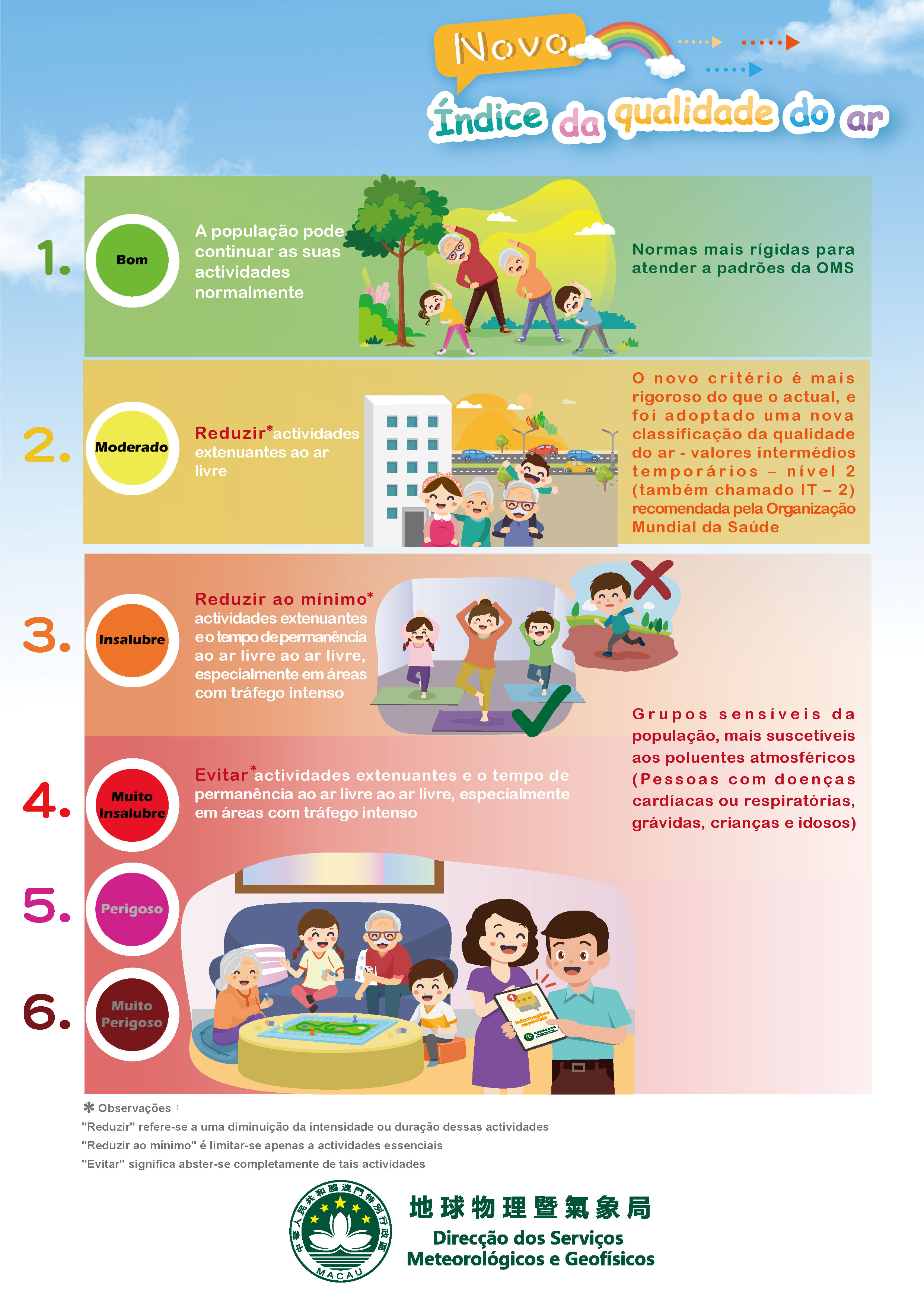Com o intuito de proteger a saúde pública, a Direcção dos Serviços Meteorológicos e Geofísicos, vai actualizar o índice da qualidade do ar (IQA), a partir de 1 de Janeiro de 2021, adoptando padrões mais rigorosos para as concentrações de poluentes que correspondem a vários níveis da qualidade do ar. Simultaneamente, vão reforçar-se os alertas e as recomendações e medidas preventivas para grupos sensíveis da população. Os ícones e a forma de apresentação serão actualizados.
