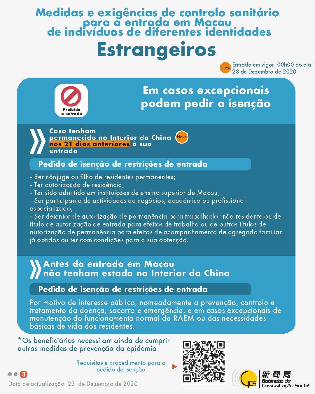 Medidas e exigências de controlo sanitário para a entrada em Macau de indivíduos de diferentes identidades