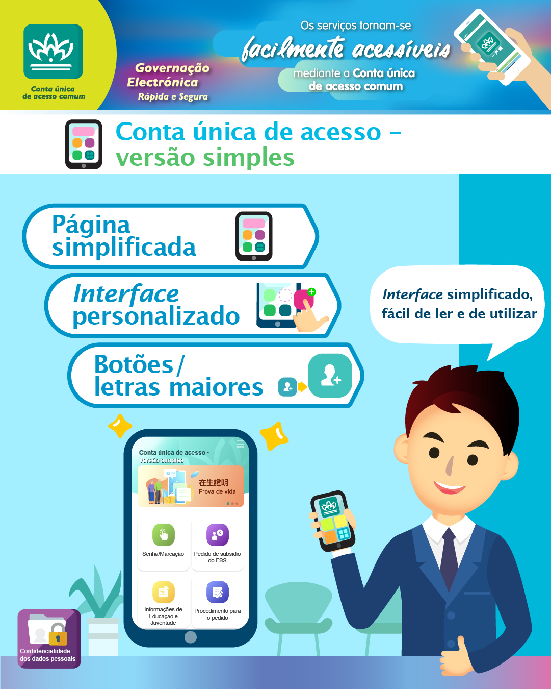 A partir das 09H00 do dia 1 de Janeiro de 2021, os cidadãos podem tratar da Prova de vida exigida pelo Fundo de Segurança Social (FSS), pelo Instituto de Acção Social (IAS) ou pelo Fundo de Pensões (FP), através de requerimento, somente uma vez, mediante “Conta única de acesso comum”, sem necessidade de se dirigirem aos balcões de atendimento, permitindo mesmo aos indivíduos fora de Macau ou com dificuldades motores a possibilidade de fazê-lo online. Simultaneamente, a Direcção dos Serviços de Administração e Função Pública (SAFP) lançará uma versão simples da aplicação para telemóvel “Conta única de acesso”. Com a simplificação da página, a ampliação das letras e a configuração personalizada das funções, o interface operacional simplificado será mais acessível e proporcionará aos utentes uma nova experiência.